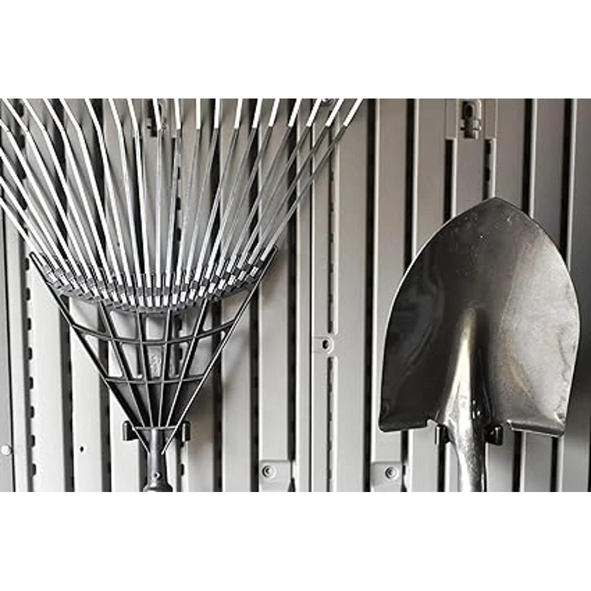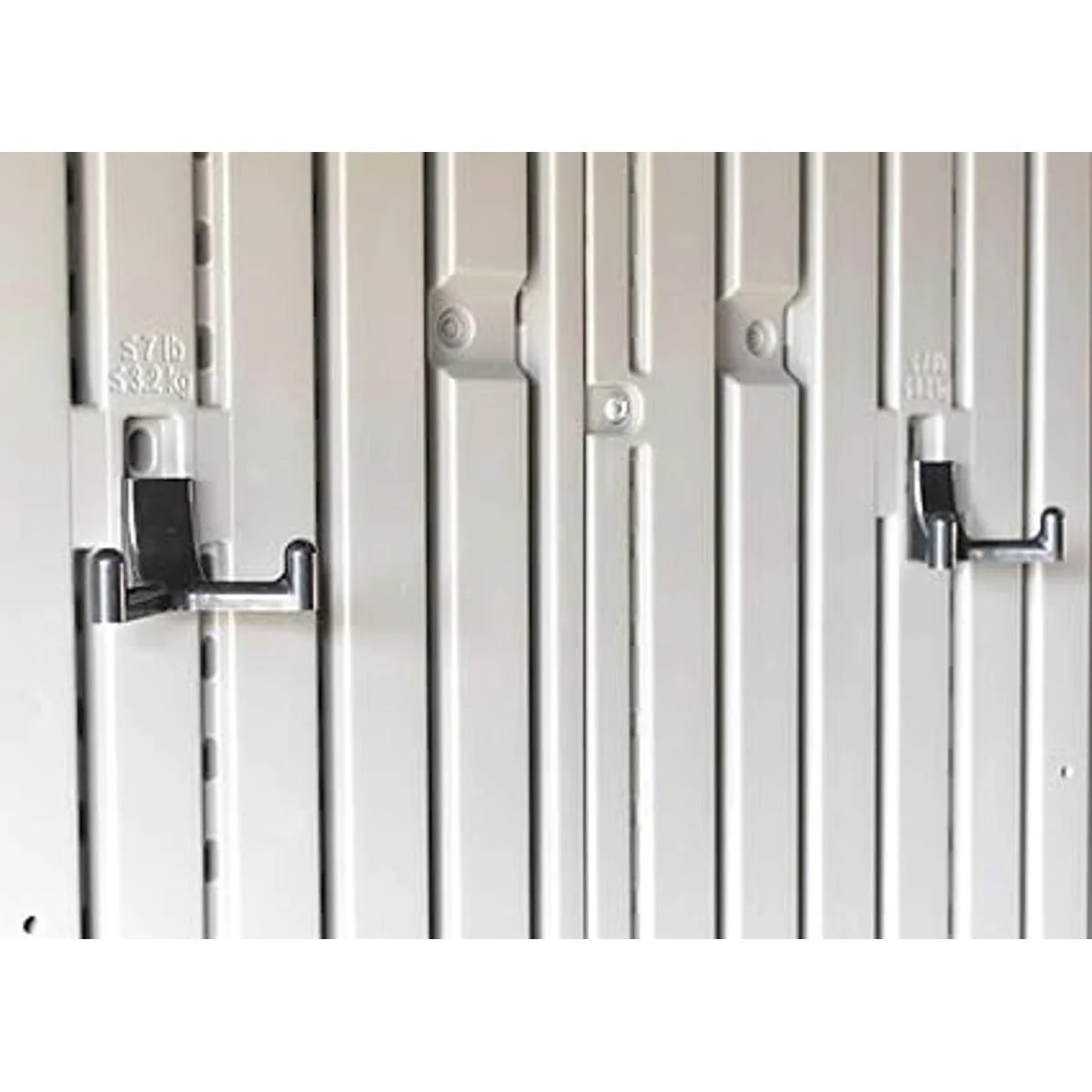 Ganchos para herramientas hechos específicamente para adaptarse a las muescas en cobertizos de por vida con revestimiento vertical. Nota: no funciona con cobertizos que tienen revestimiento horizontal