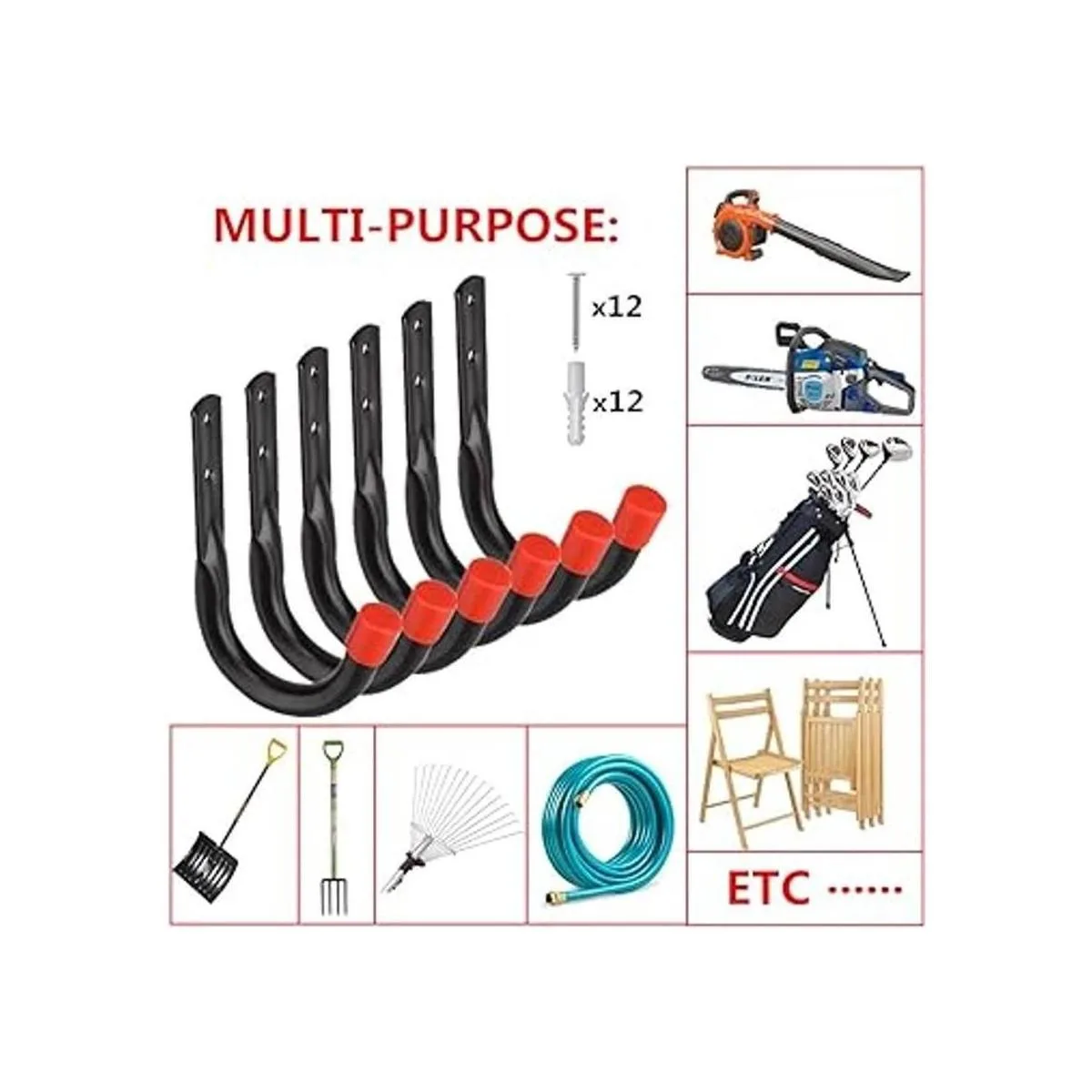 Multiusos: los ganchos para colgar son ideales para organizar bicicletas, sillas, escaleras, mangueras, bolsas de herramientas, kayak, palas, equipos deportivos, sopladores de hojas y nieve, paraguas de patio.