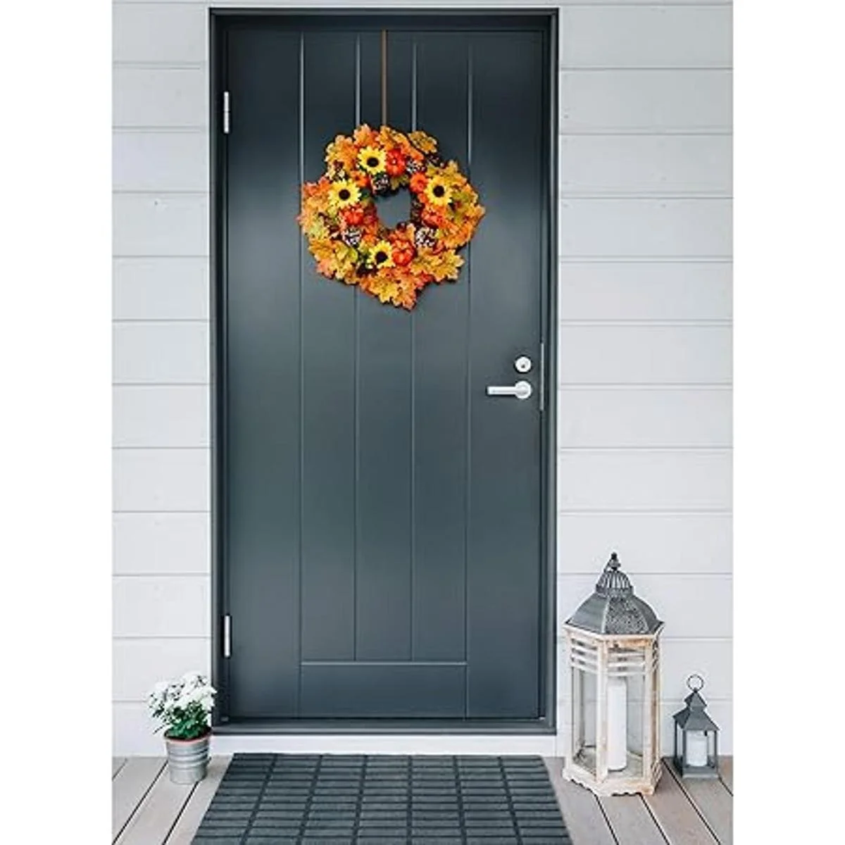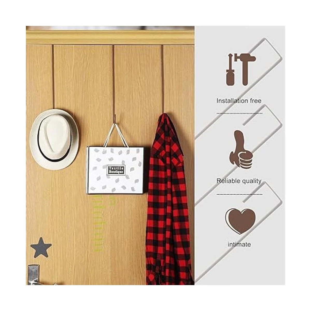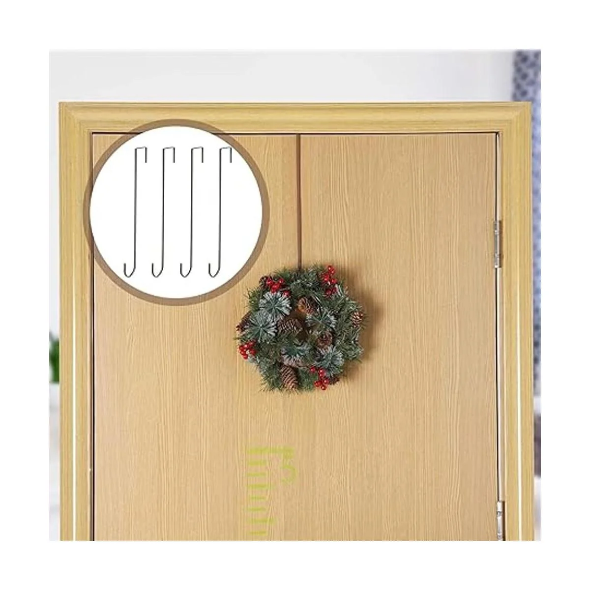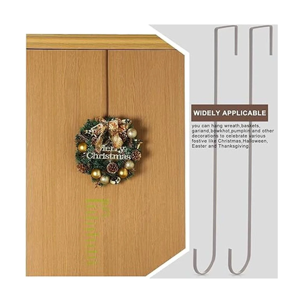 Instalación sencilla: simplemente cuelga el gancho de corona sobre tu puerta delantera o trasera de tu casa, no requiere tornillos, clavos o perforaciones, puedes colgar coronas de Navidad, ropa, guirnalda, cesta de aperitivos, etc. para decoraciones de puertas