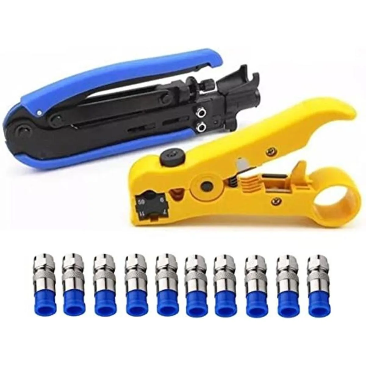 Gaobige Herramienta de compresión coaxial, kit de crimpadora de cable coaxial ajustable rg6 rg59 rg11 755 757 coaxial pelacables con 10 conectores de compresión F, color azul
