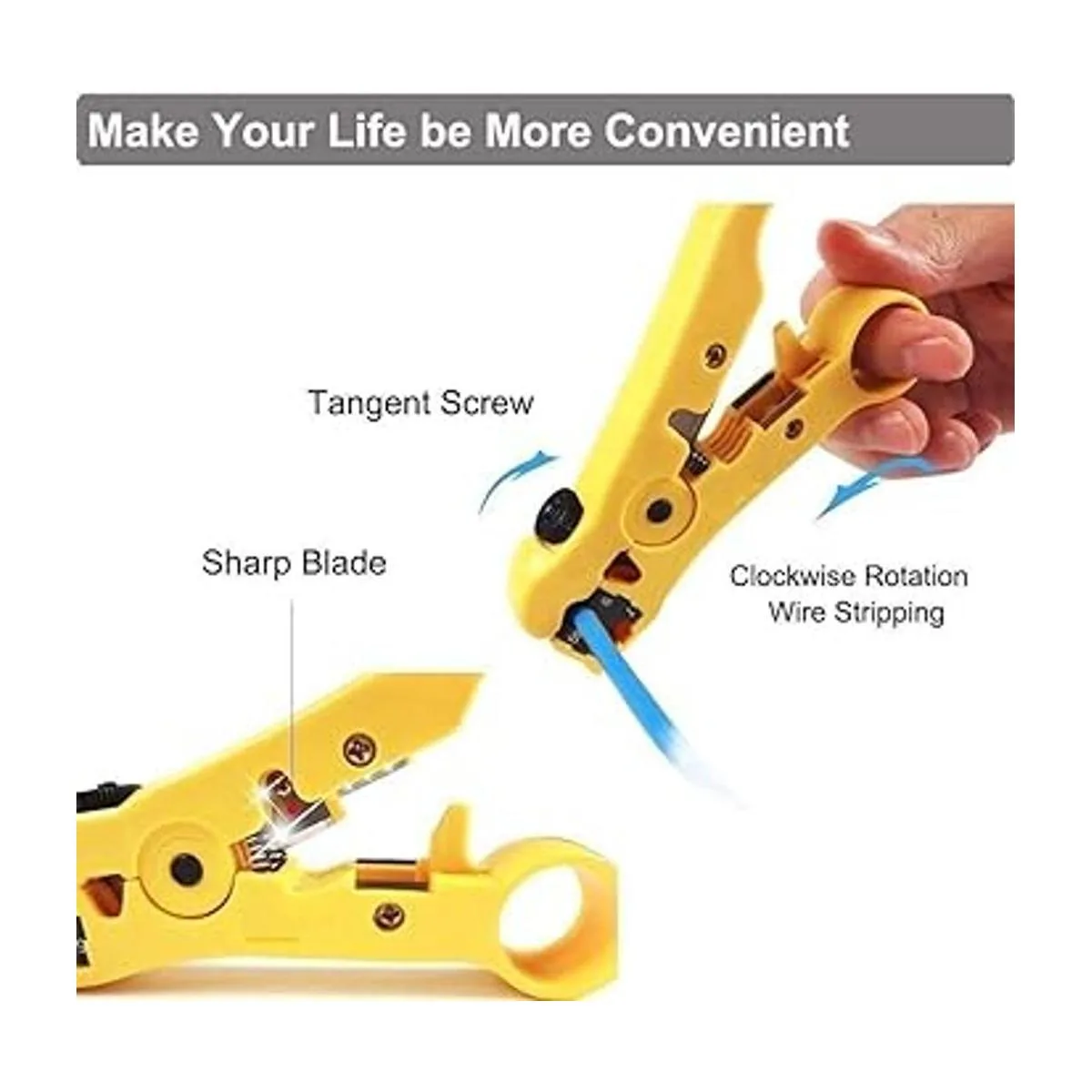 La hoja duradera de refinamiento de acero se puede cortar y pelar rápidamente: Equipado con pelacables coaxiales, pelacables redondo, cortador y pelacables plano. El casete es reversible, un lado está disponible para rg 59/6 y otro lado para rg 7/11.