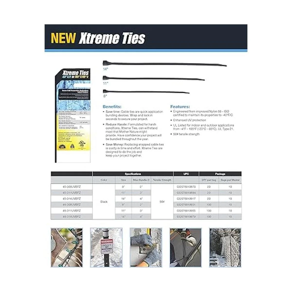 gardner bender 45 – 308uvbfz Xtreme Temperatura fría y caliente Cable Tie, 8 inch., 50 libras. Resistencia, 20 PK., color negro, 45311UVBFZ, 0 volts