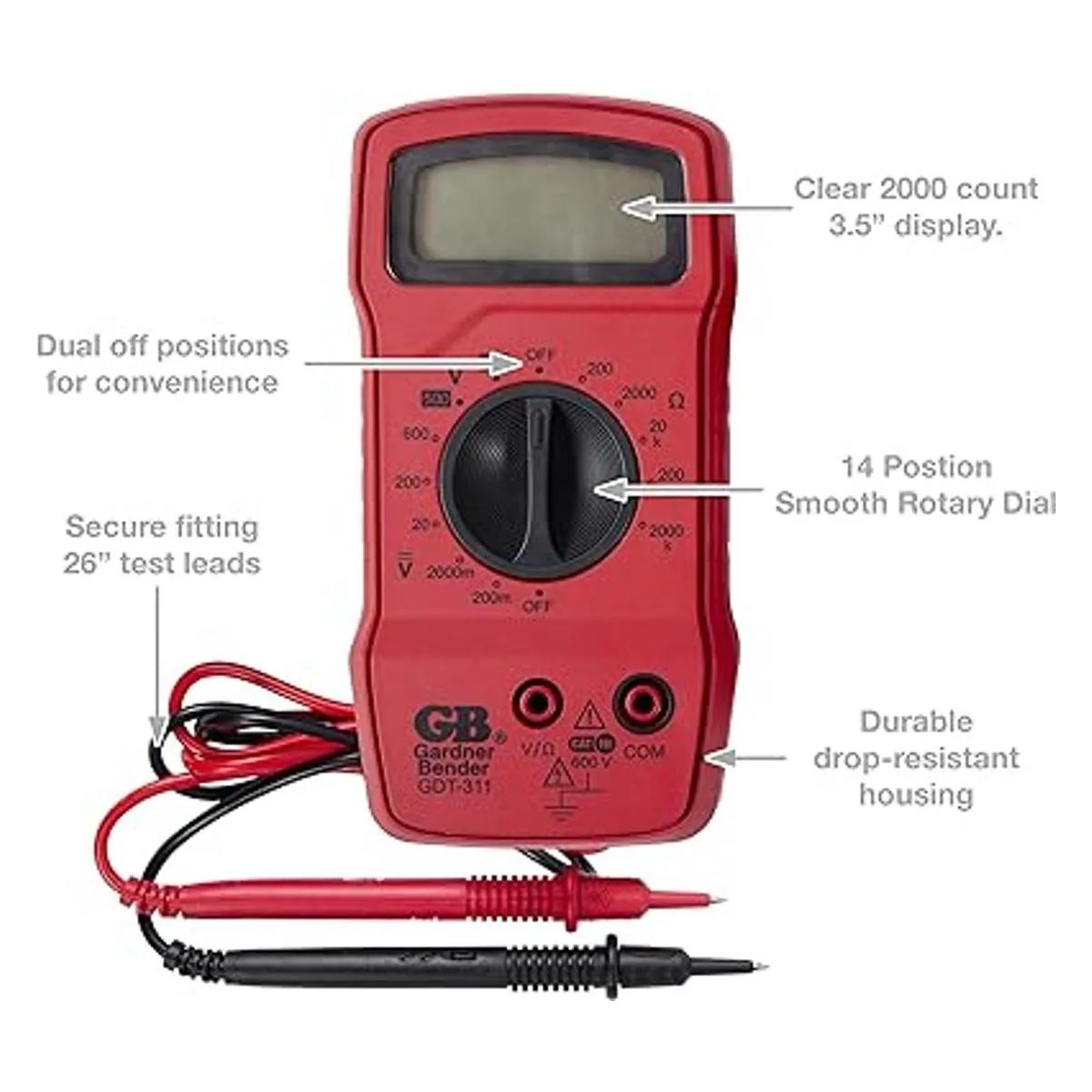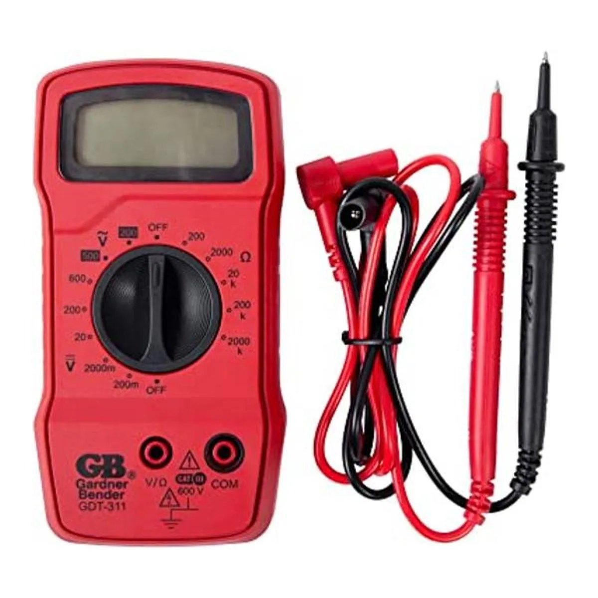 Gardner Bender Multímetro digital GDT311, 3 funciones, rango 11, prueba voltaje y resistencia ACDC, rango manual, pantalla de 3.5 pulgadas, 1cada uno, rojo