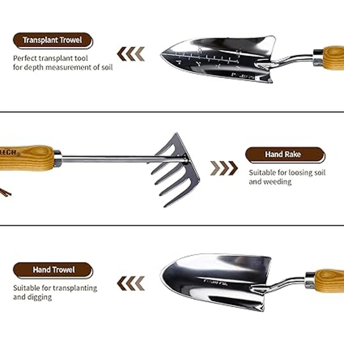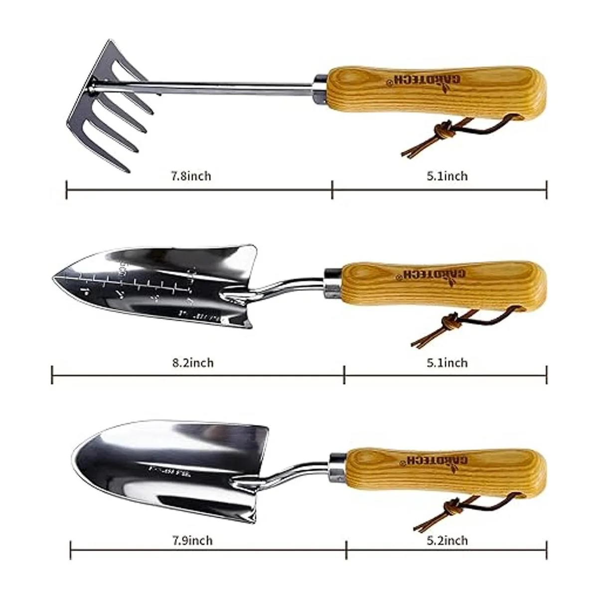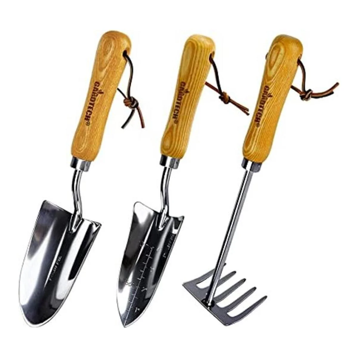 Gardtech Juego de herramientas de jardín, hecho de mango de madera de ceniza real y acero inoxidable grueso, 3 piezas, incluyendo paleta de mano de jardín, trasplante, cultivadorjardinería regalos para jardinero