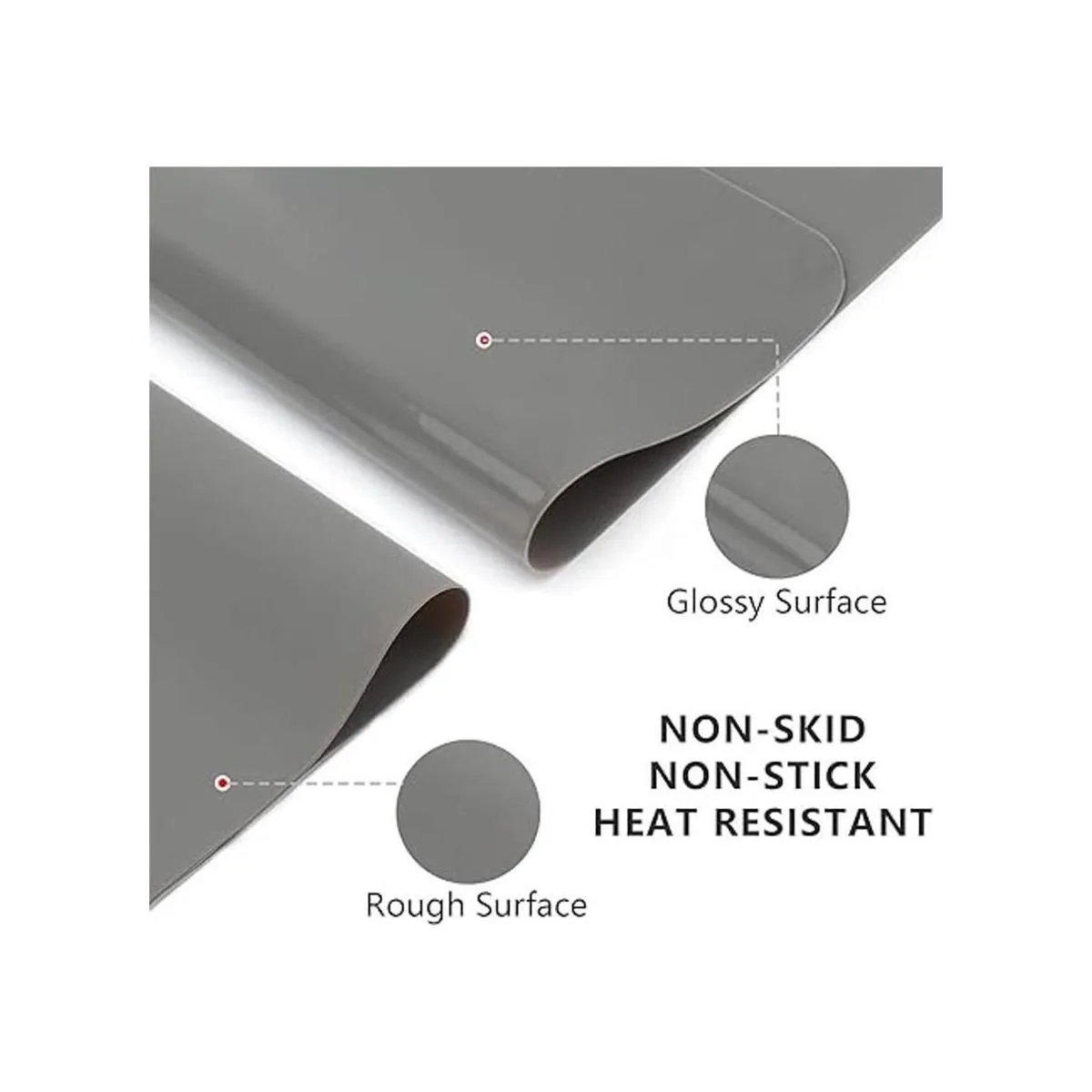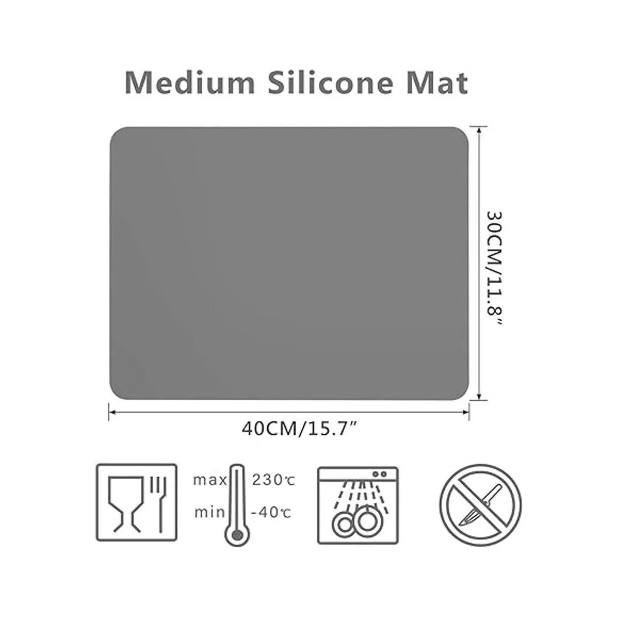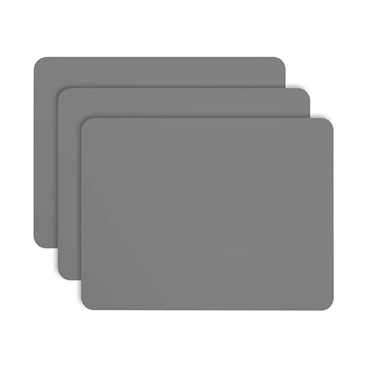 Parte trasera antideslizante: 3 hojas de silicona estándar de tamaño mediano que miden 15.7 x 11.8 in. Un lado es de superficie lisa utiliza esta boca abajo, el otro lado está esmerilado utiliza esta boca arriba.