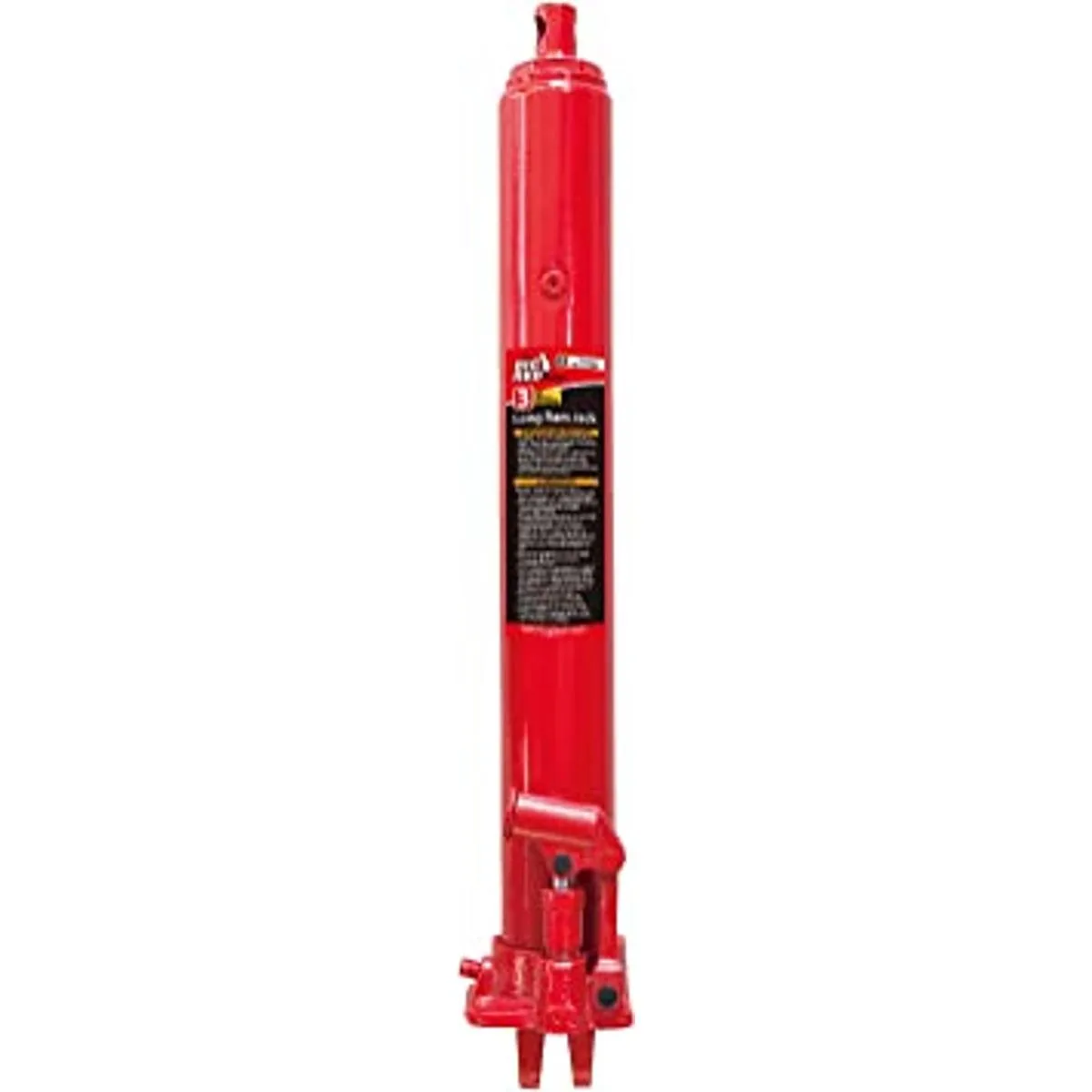 Hydraulic long ram jack has a single piston pump and clevis base designed for residential and commercial use