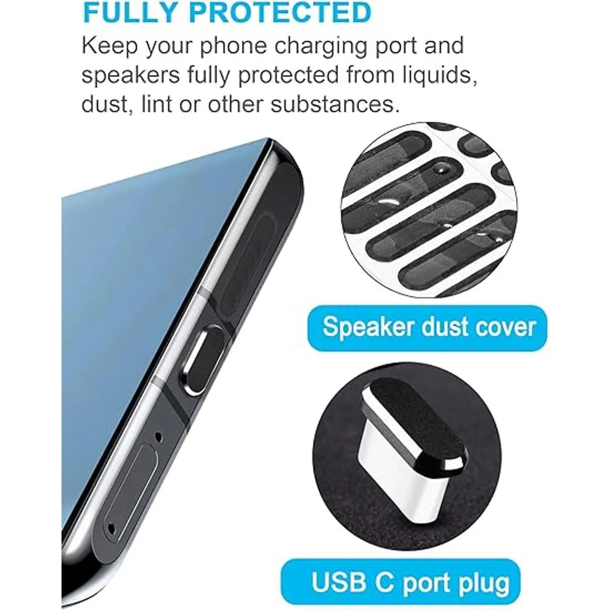 Tapón antipolvo USB C: el kit de malla de cubierta de altavoz incluido protege completamente tu smartphone de líquidos, polvo, pelusa u otras sustancias contra tu puerto de carga.