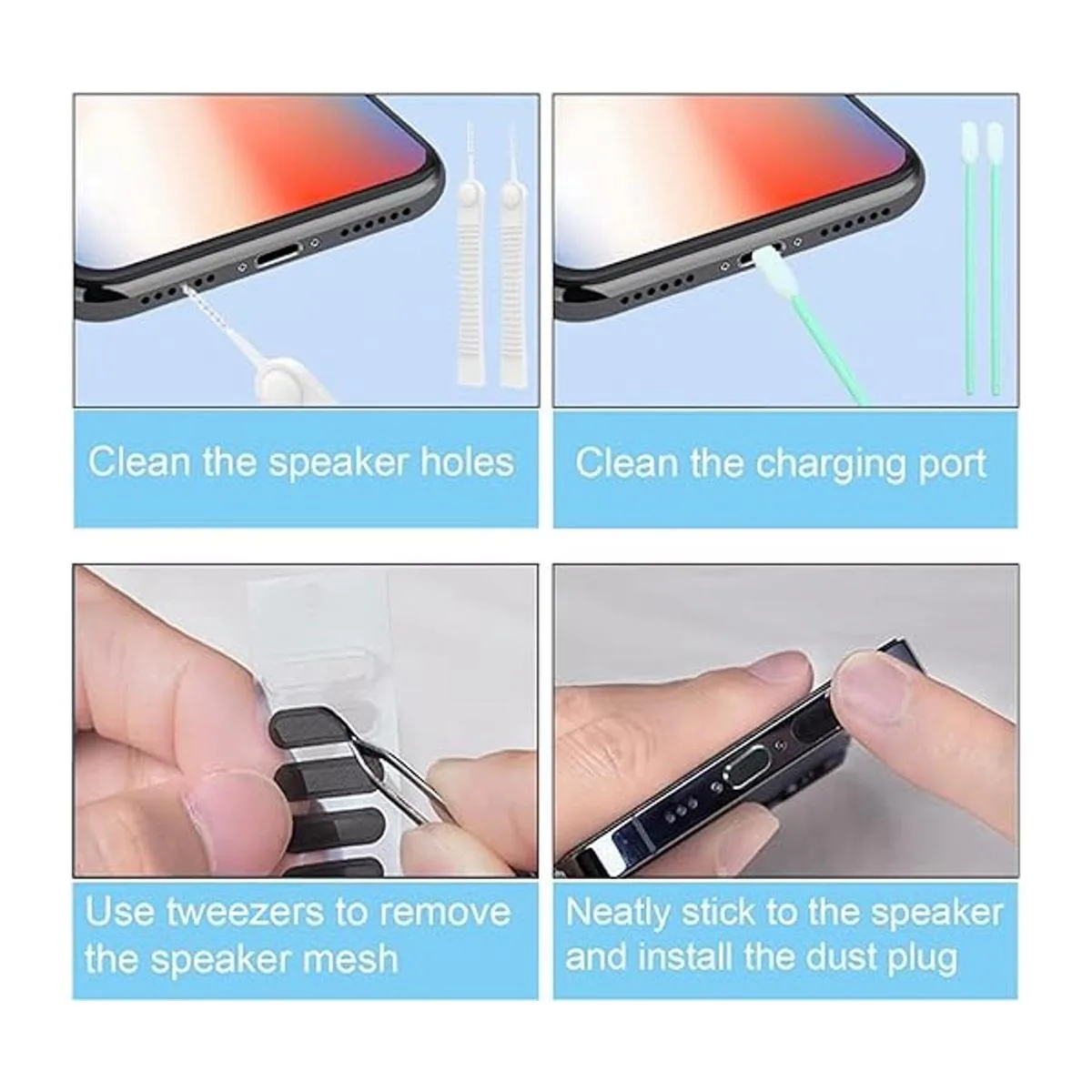 Estás a punto de obtener: 4 fundas de enchufe USB C, 20 fundas antipolvo para altavoces, 1 pinzas, 2 cepillos de limpieza, 2 hisopos de algodón, 1 enchufe para auriculares. Ten en cuenta que solo se admiten dispositivos de puerto USB C, no se admiten otros puertos.