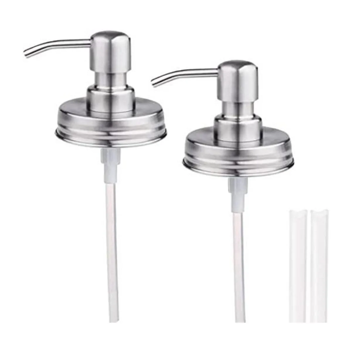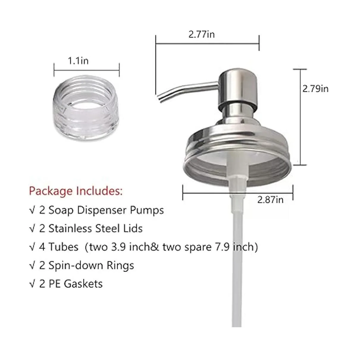 El paquete incluye: 2 tapas plateadas de acero inoxidable 2 bombas dispensadoras de jabón 4 pajitas dos 3.9 pulgadas y dos de repuesto 7.9 pulgadas 2 anillos giratorios 2 juntas de polietileno.