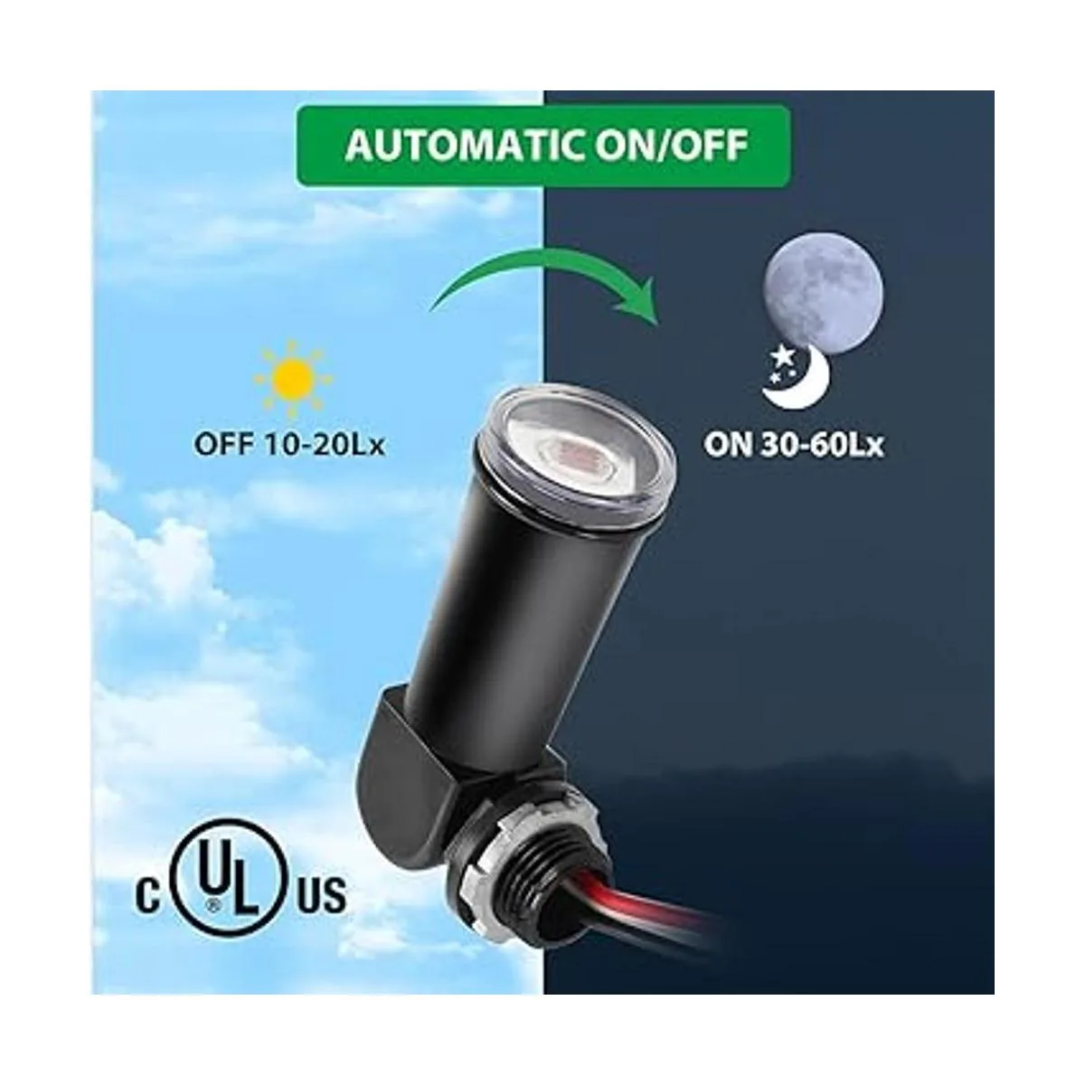 IP65 impermeable y seguridad: listado UL. La carcasa del sensor de luz fotoeléctrico está hecha de policarbonato de alta calidad, que es preventivo de la corrosión y resistente al agua para garantizar una vida útil más larga. Este sensor de luz nocturna garantiza la luz cuando está oscuro. mantiene alejados a los intrusos seguros y no deseados.