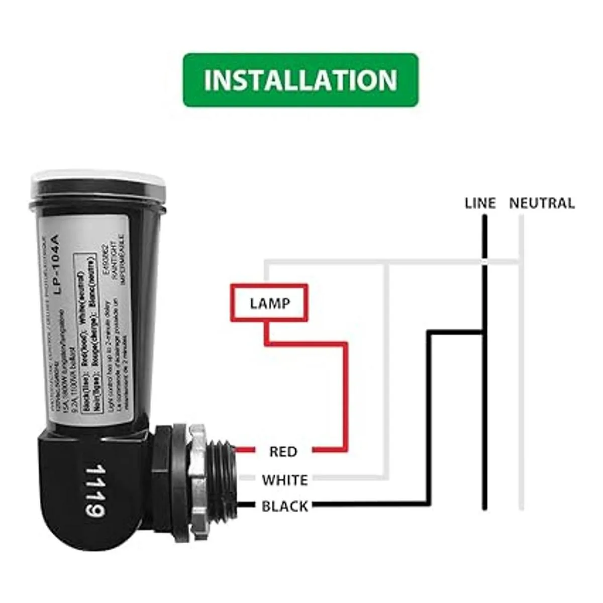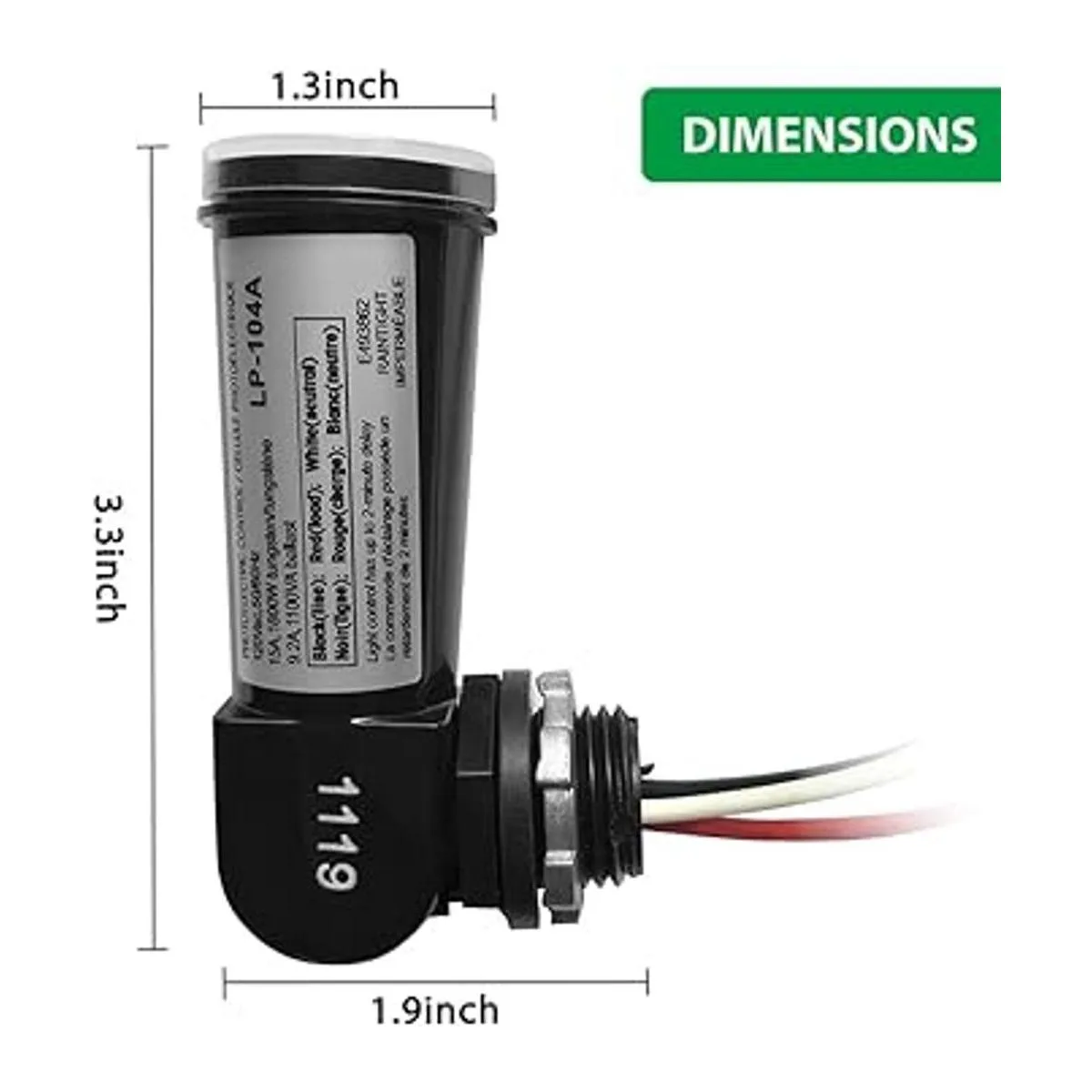 Sensor de fotocélula automático inteligente: el sensor de atardecer a amanecer enciende automáticamente la luz al anochecer y se apaga al amanecer, lo que te da ahorro de energía y comodidad sin la necesidad de un funcionamiento manual. Tensión nominal: 120 VAC; Voltaje aplicable: 110130 VAC; Carga nominal: tungsteno de 1800 W; balasto de 1800 VA.