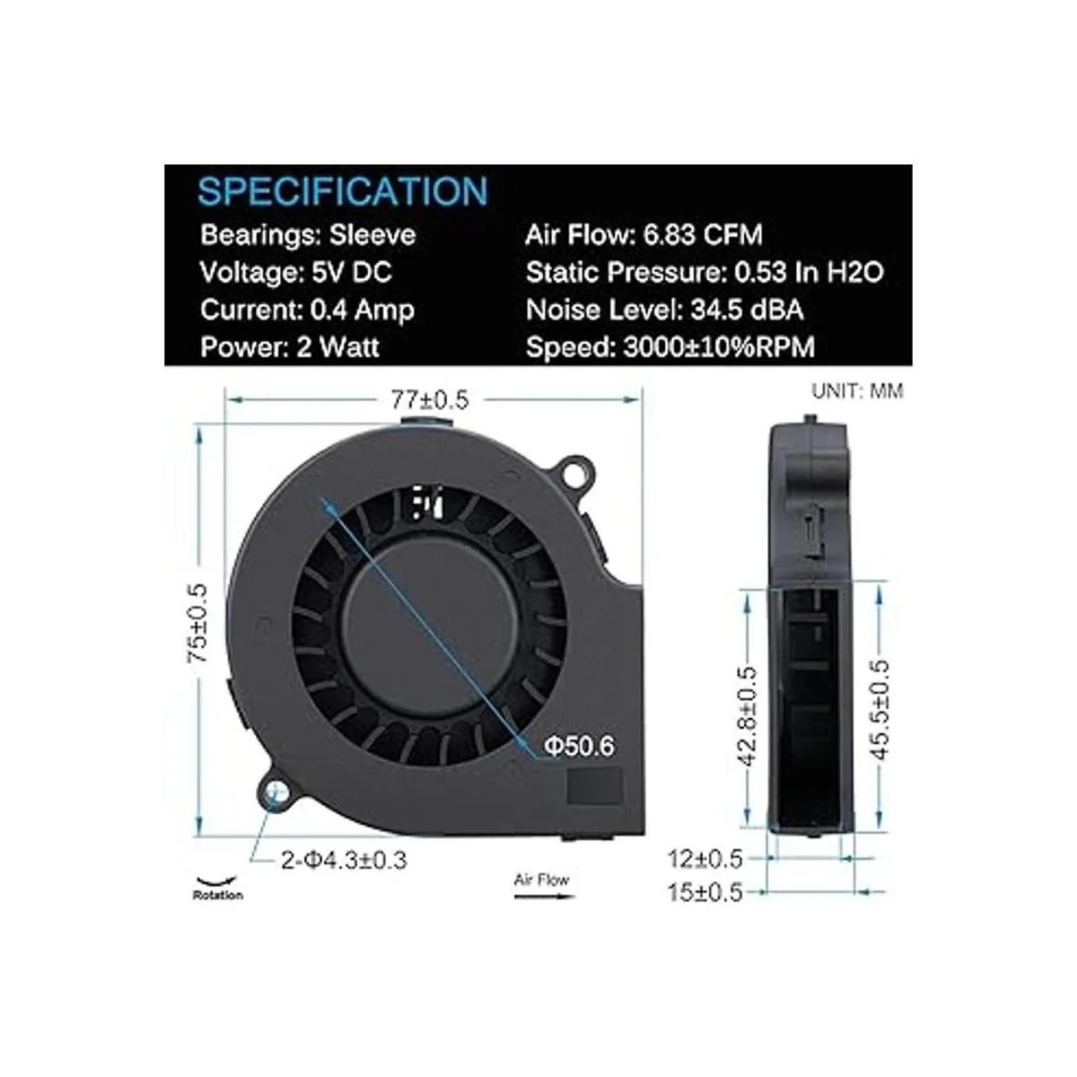 Soplador 7515: rodamientos: manga Voltaje nominal: 5 V CC Corriente: 0,4 amperios Potencia: 2 W Flujo de aire: 6,83 CFM Presión estática: 0,53 pulgadas H2O Velocidad del ventilador: 3000 RPM Vida útil: 35,000 horas