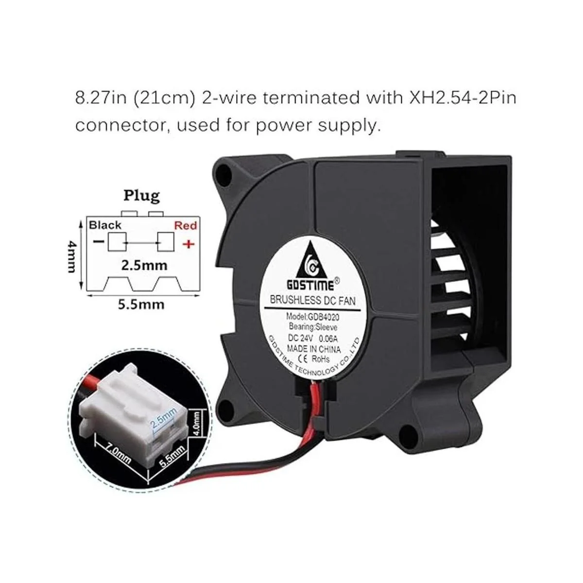 Conector de 2 pines: longitud del cable de 8.3 in, 2 cables terminados con conector XH2.542 pines para fuente de alimentación; cable rojo: positve, negro: negativo