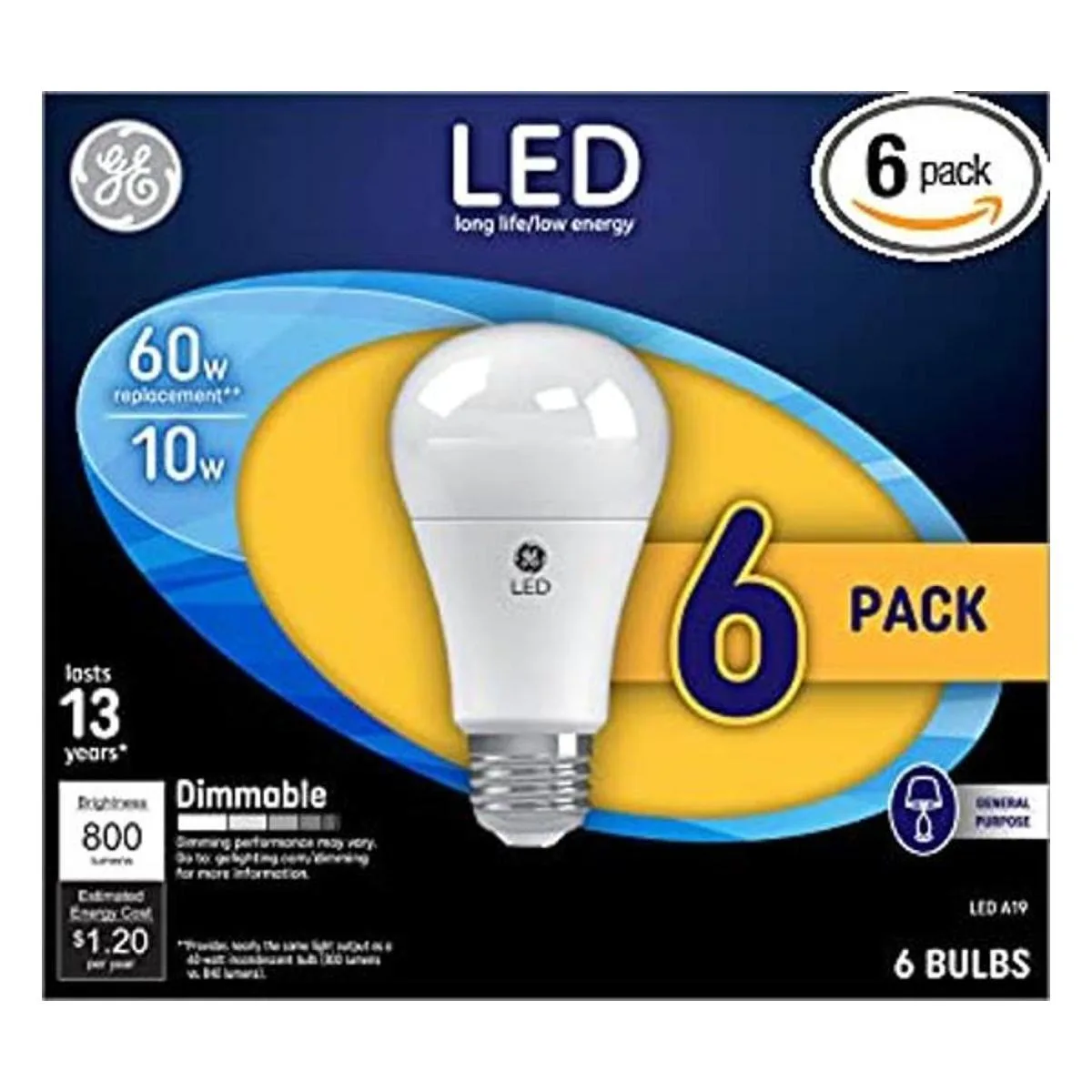 GE Bombillas LED A19, bombilla estándar de 10 W equivalente a 40 W, color blanco suave, base media, regulable paquete de 6