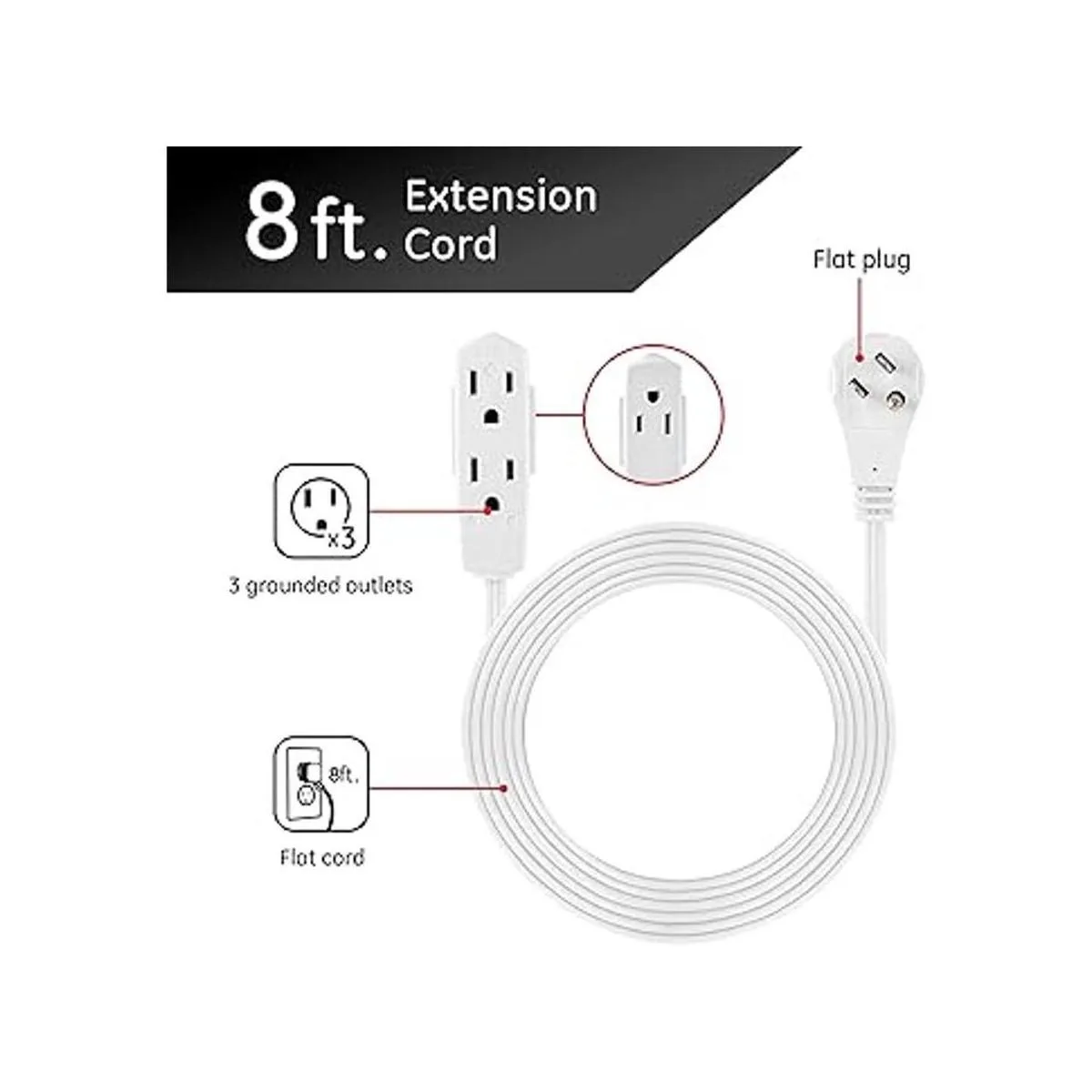 Alcance más largo: 8 pies. El cable de alimentación extralargo es perfecto para tu lámpara de escritorio, ventilador portátil, laptop, cargador de teléfono, aspiradora, reloj despertador y otros dispositivos electrónicos del hogar que necesitan un poco de longitud extra.