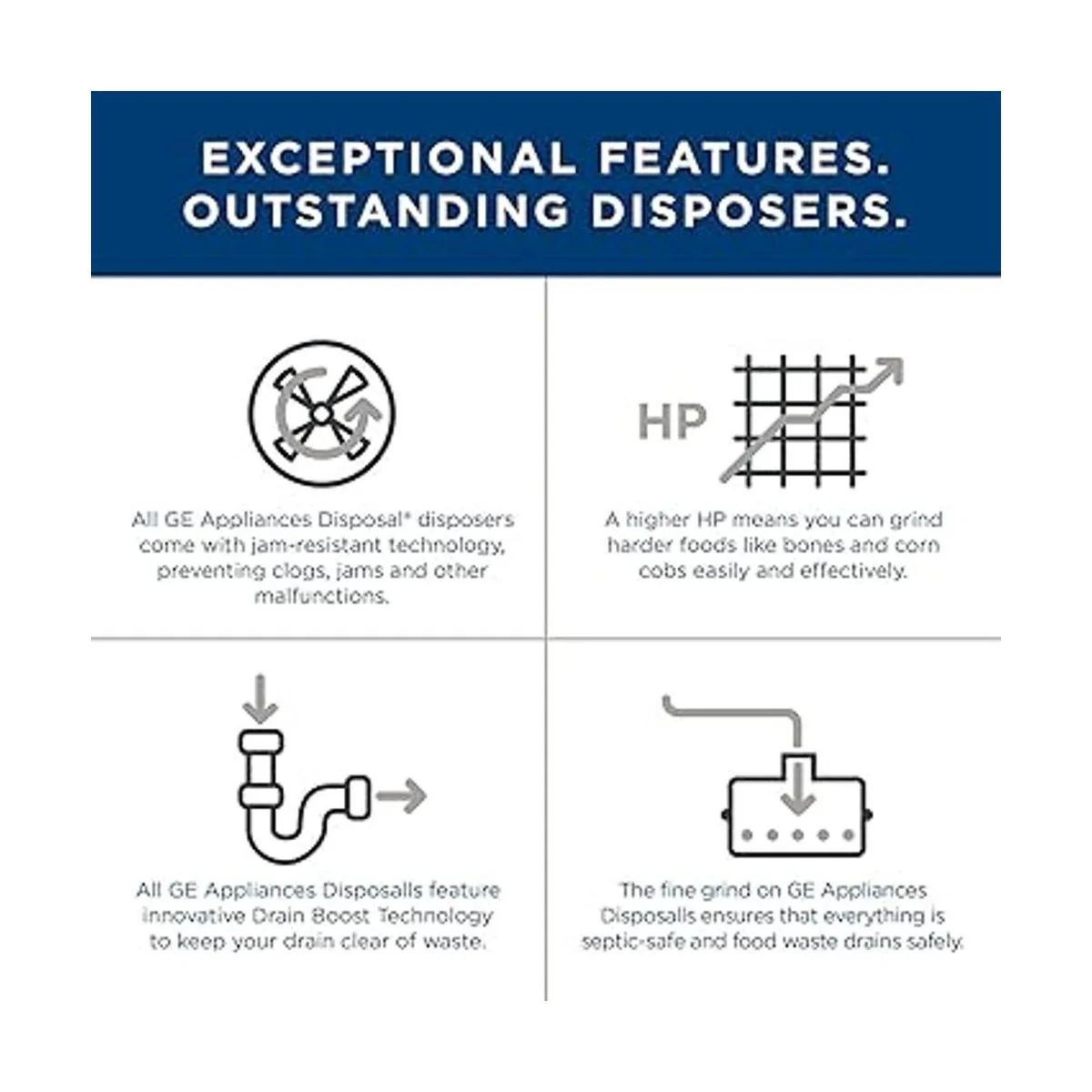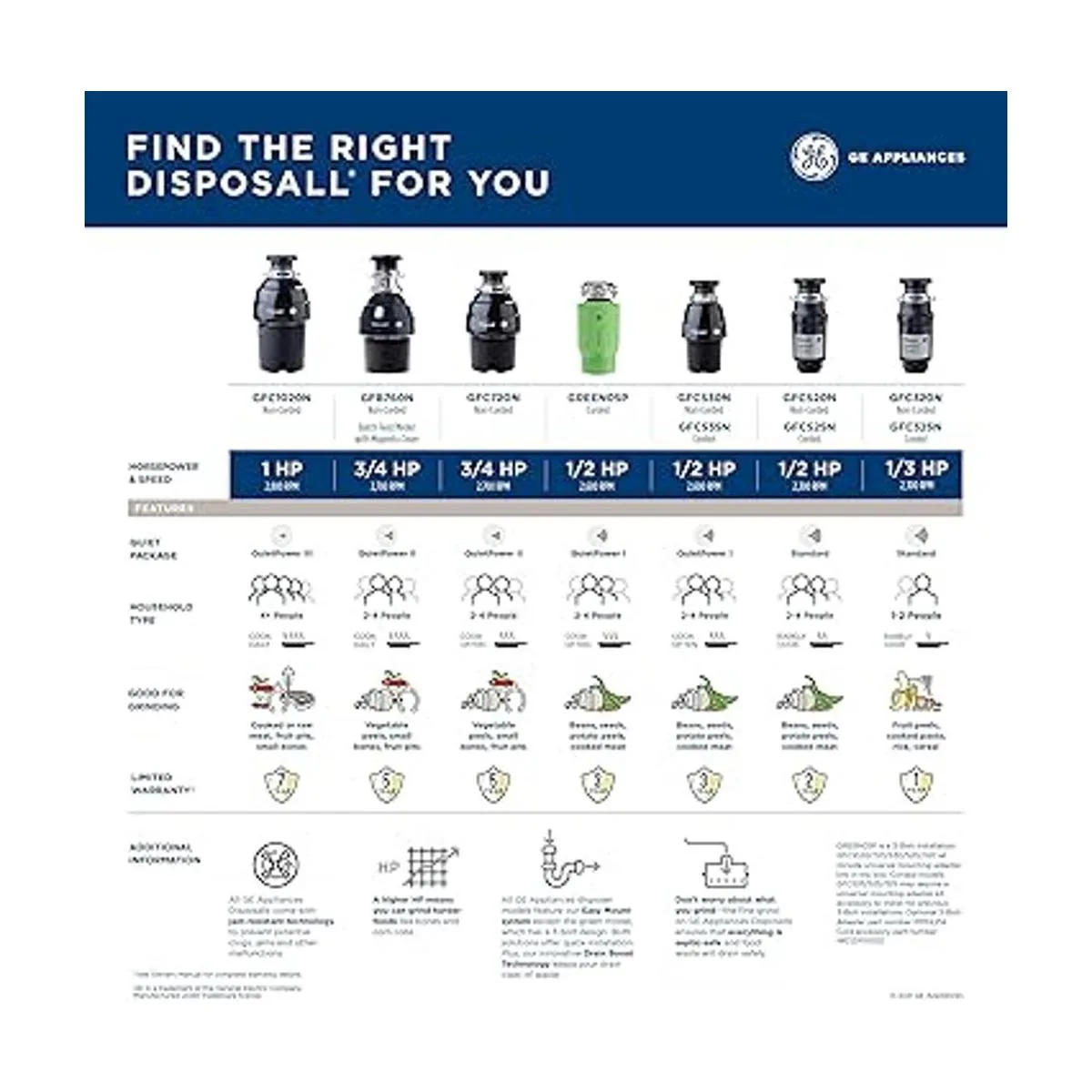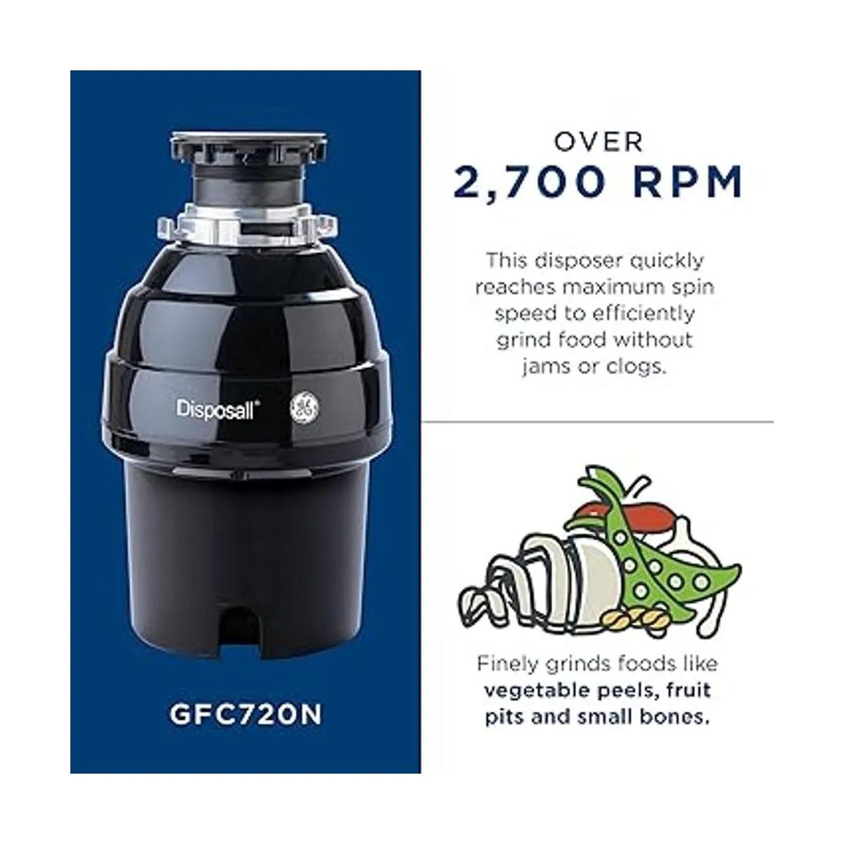 GE Eliminación de basura de alimentación continua, 34 caballos de fuerza y más de 2.700 RPM, bueno para moler huesos pequeños, cáscaras de verduras y pozos de frutas, kit de fácil instalación incluido, sin cable, lo mejor para cocinar frecuente