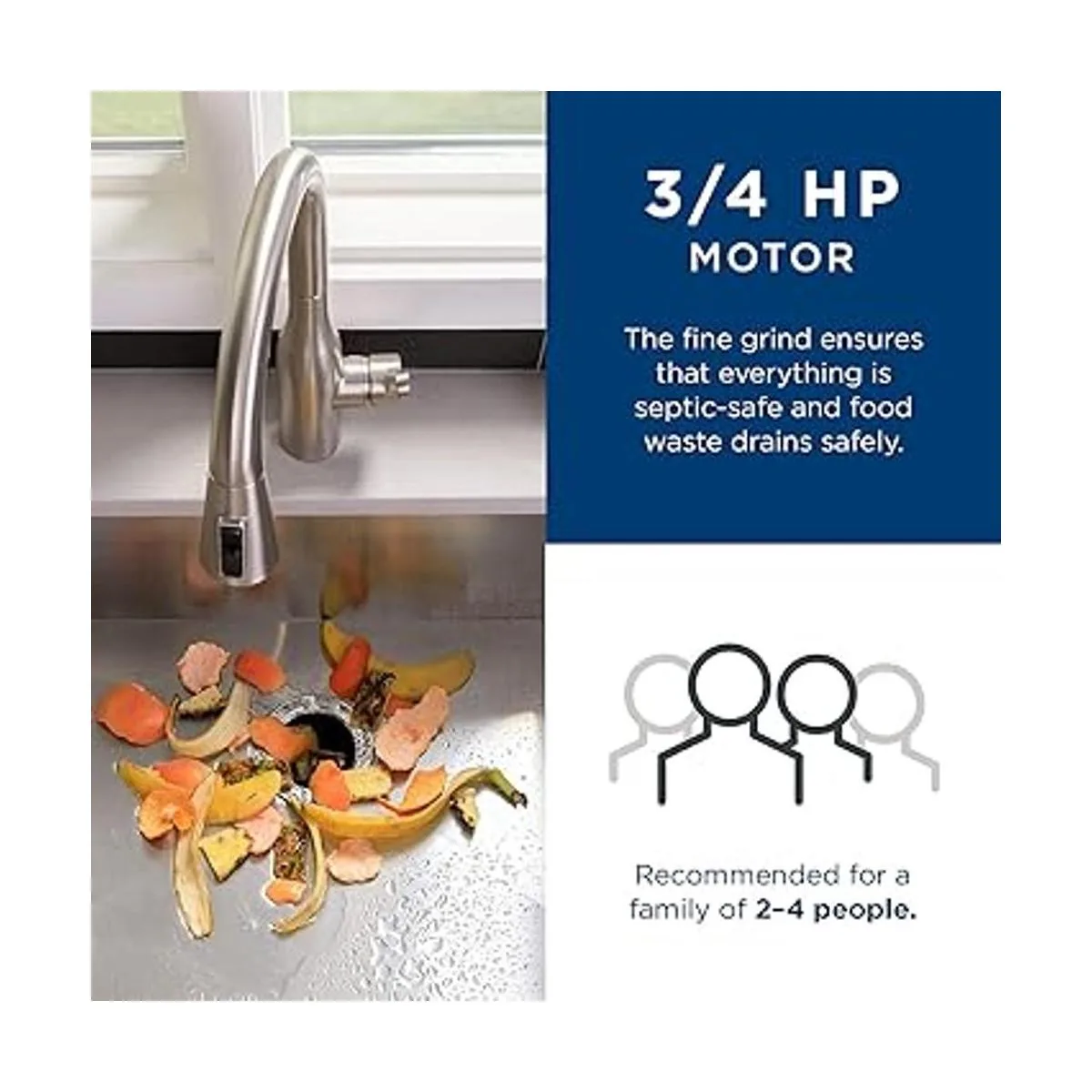 Motor de 3/4 HP: una potente eliminación de basura de 3/4 HP alcanza rápidamente su máxima velocidad de giro, por lo que puede moler alimentos duros más rápido sin atascos ni obstrucciones. Esta es la eliminación de alta velocidad recomendada para una familia de 2 a 4 personas.