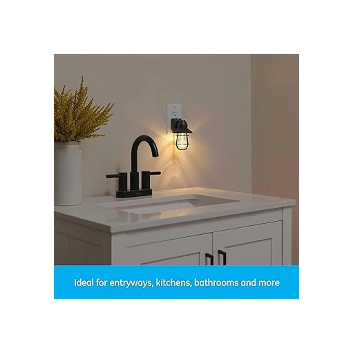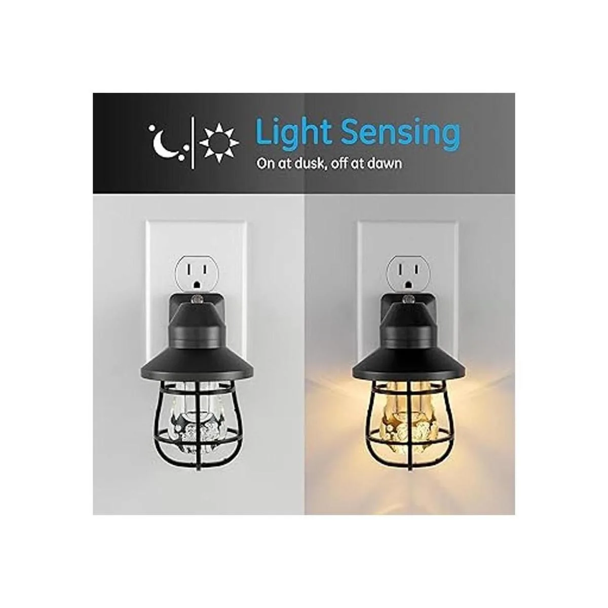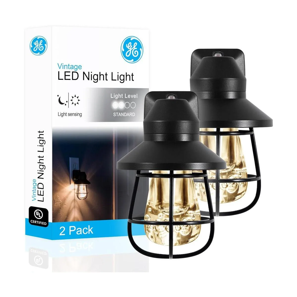GE Luz led vintage nocturna, para enchufar, con sensor que detecta el atardecer y amanecer, estilo de casa rural, decoración del hogar, certificación UL, luz nocturna ideal para dormitorio, baño, cocina, pasillo, negro, paquete de 2 unidades 44737