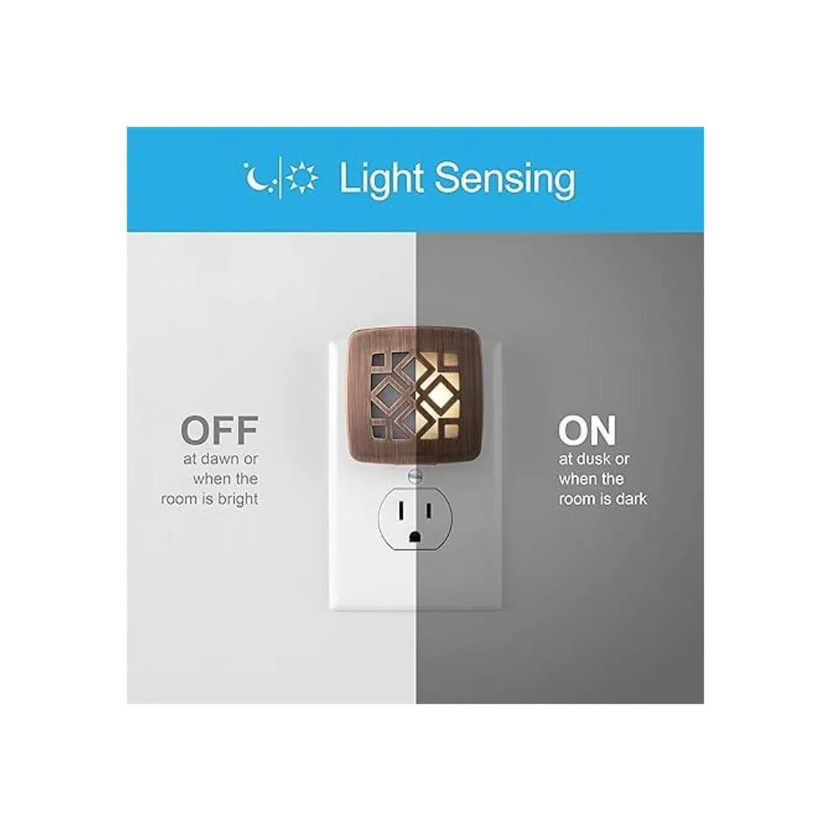 Sensor de atardecer a amanecer: el sensor de luz integrado enciende automáticamente la luz nocturna al anochecer y se apaga al amanecer