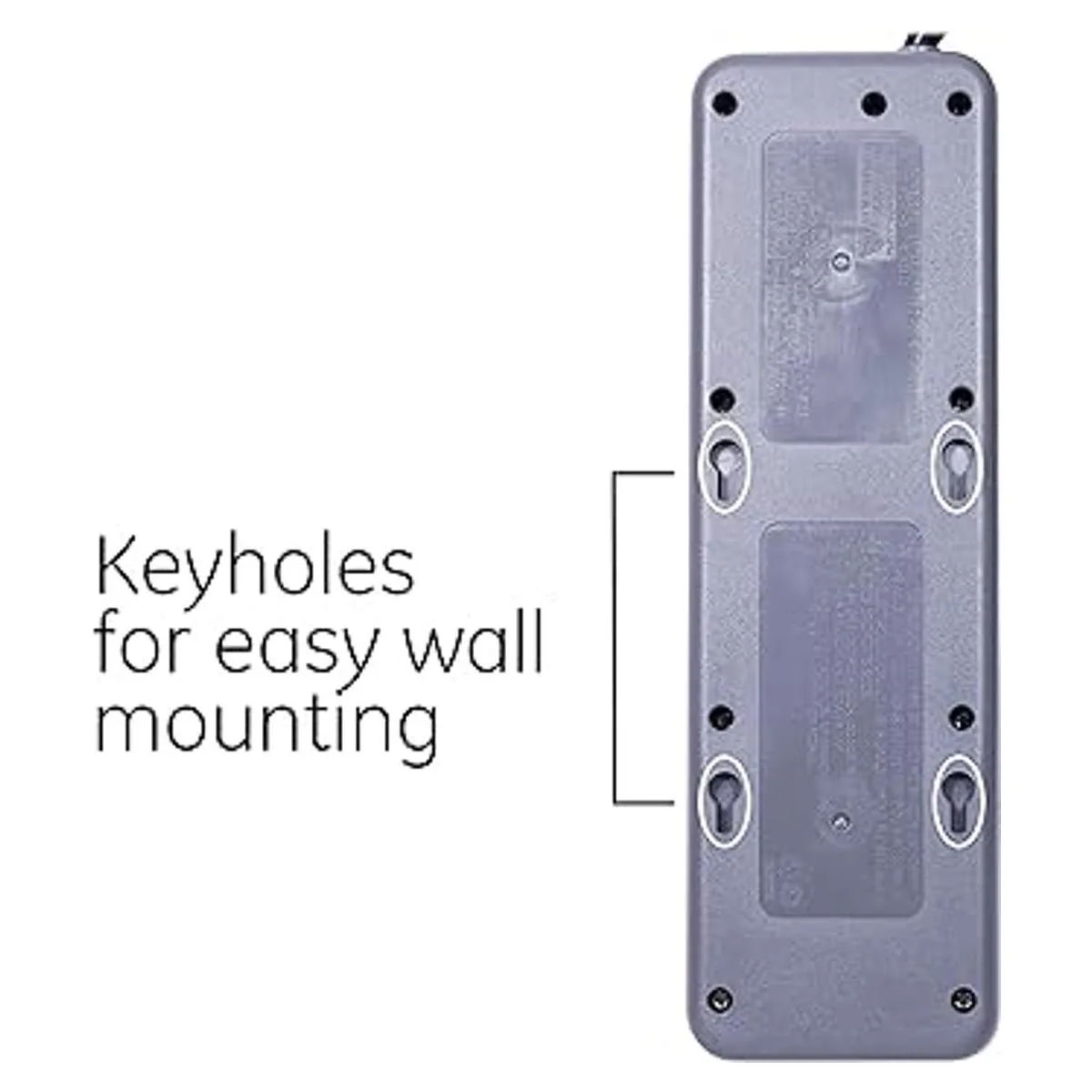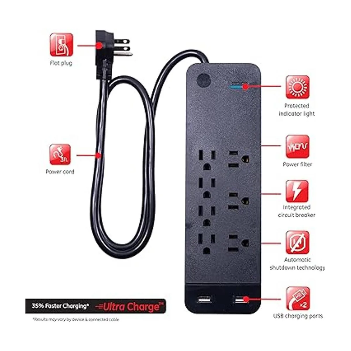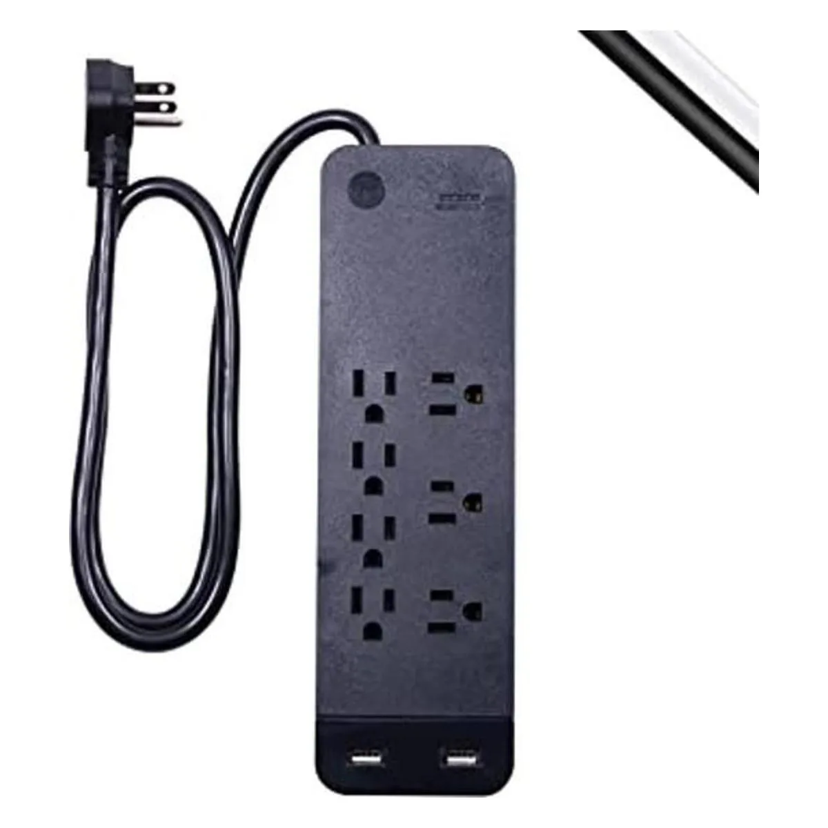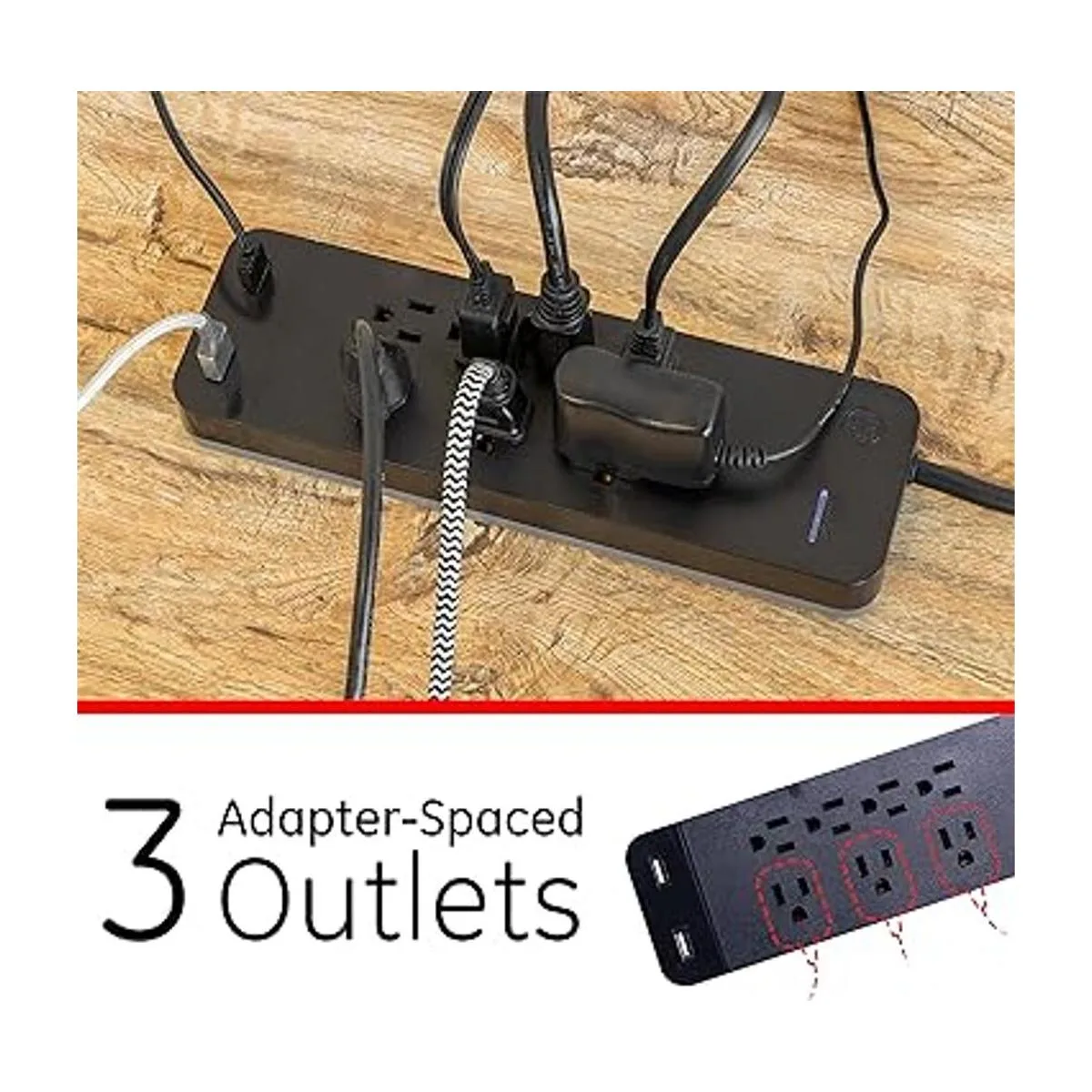 GE Pro 37054 Protector de sobretensión de 7 tomas, 2 puertos USB, cable de extensión de 3 pies, 1780 julios, 2.1 amperios10 vatios, 3 enchufes espaciados adaptadores, enchufe plano, montaje en pared, garantía, certificación UL, negro, 37054