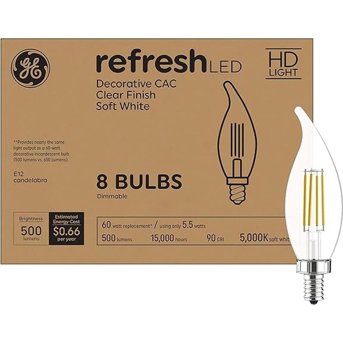 GE Refresh Bombillas LED, acabado transparente decorativo, reemplazo de 60 W, luz diurna, base de candelabro, regulable paquete de 8