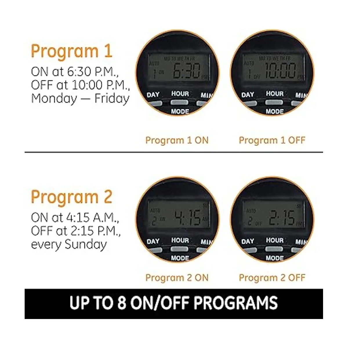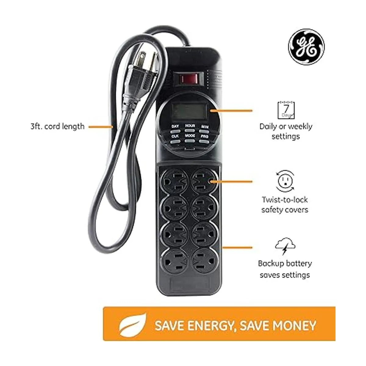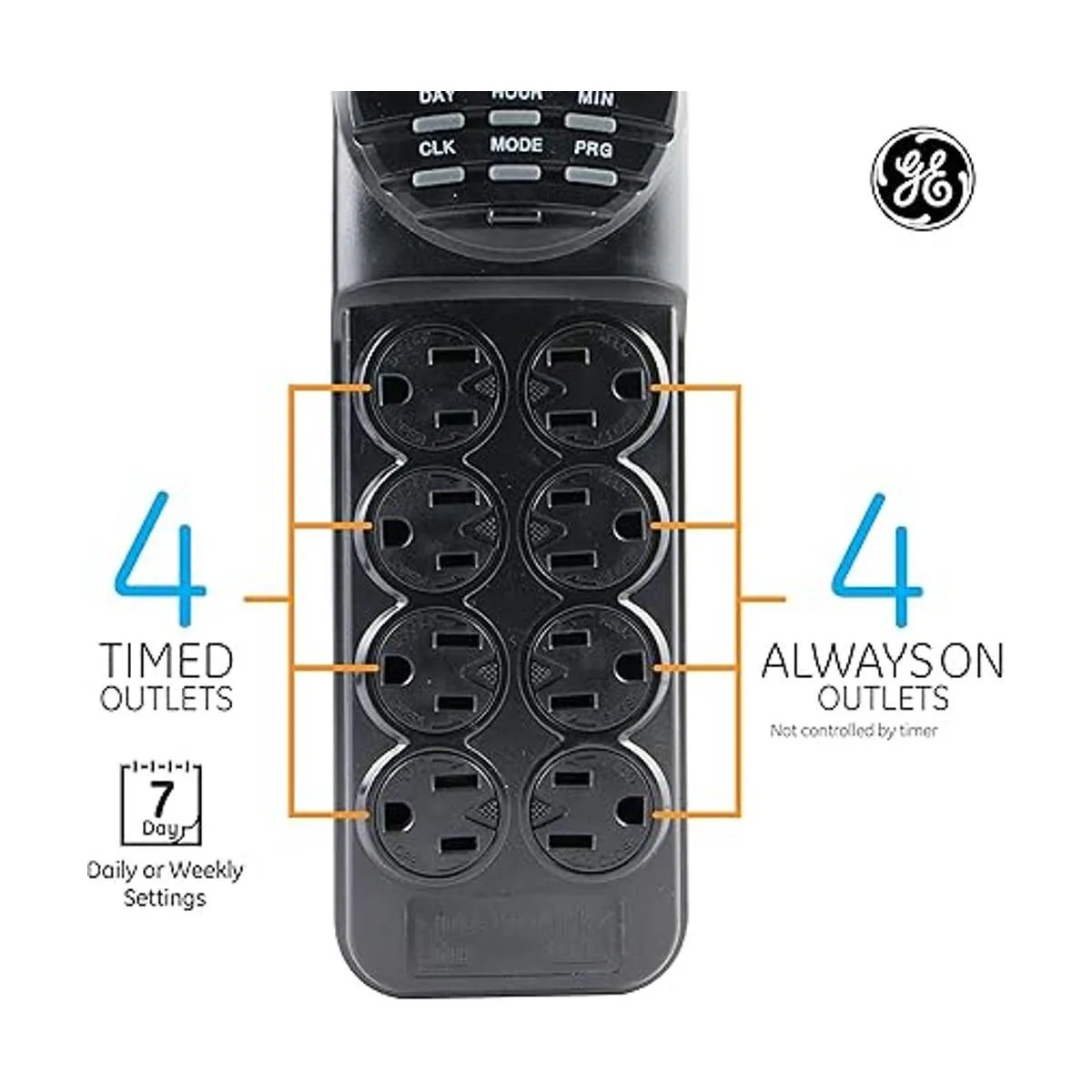 GE Regleta de alimentación programable de 7 días con temporizador digital, 8 tomas de tierra 4 temporizadas4 siempre encendidas, interior, 15 amperios, 1800 W, preajustes fáciles y ajustes personalizados para ciclo semanal, intervalos de minutos, 15077 negro