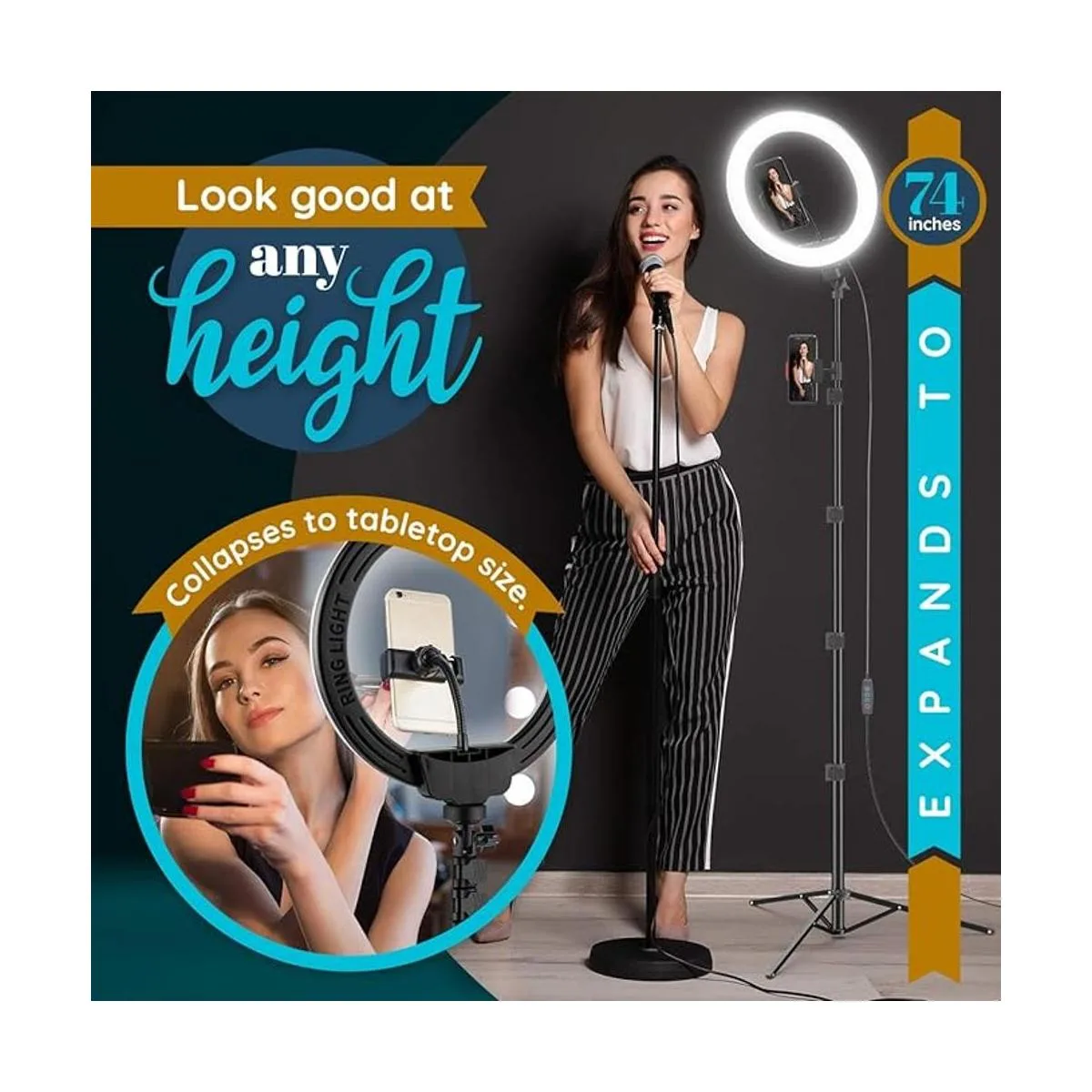 altura ajustable: este soporte de trípode ajustable para teléfono se expande hasta 60 pulgadas de altura y se pliega hasta 17 pulgadas. luce bien de pie o sentado