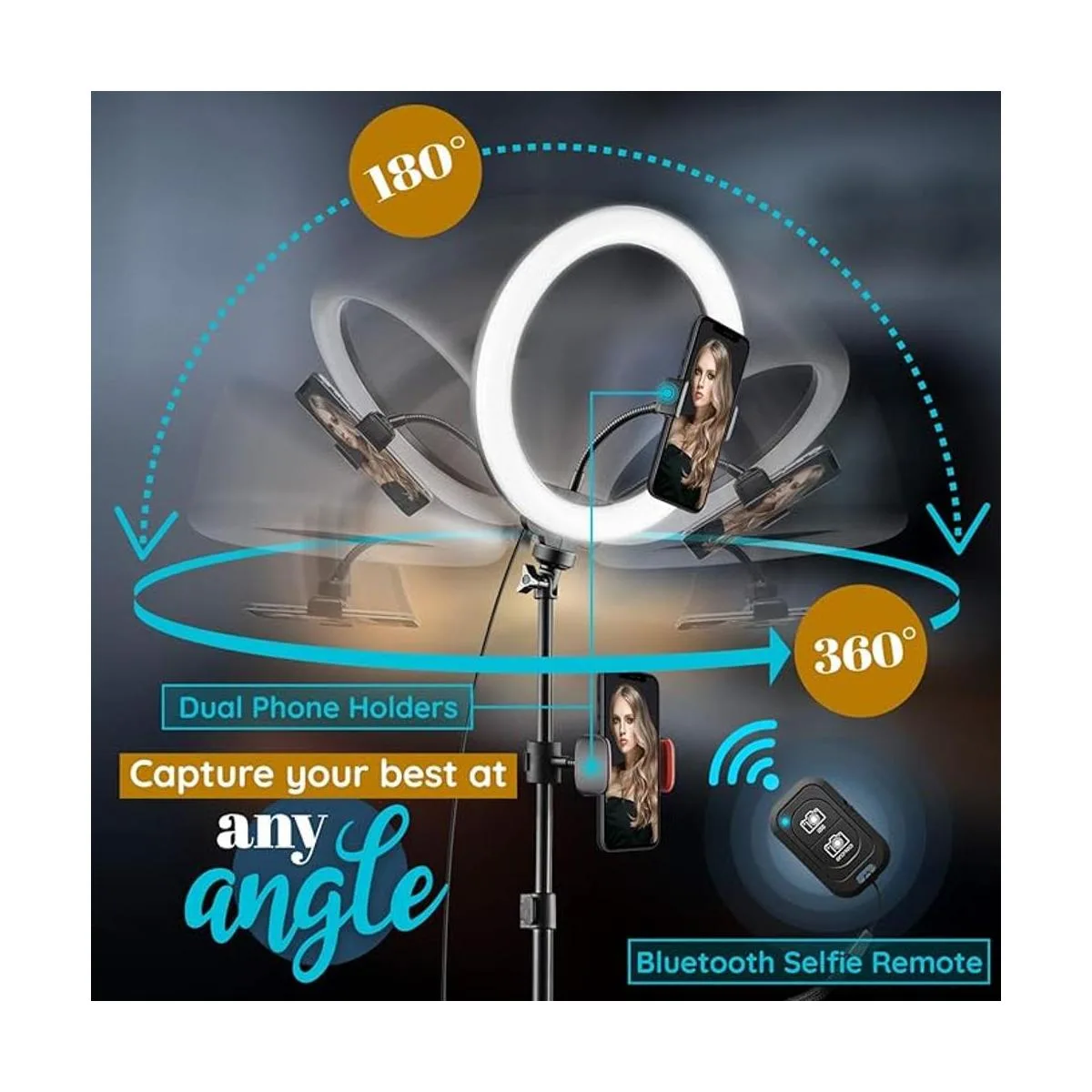 soportes dobles para teléfono: todos tenemos un buen lado, deja que nuestro anillo de luz led te ayude a capturarlo nuestro soporte para teléfono de 360 grados viene con dos soportes para que puedas montar tu teléfono en el centro o debajo del círculo.