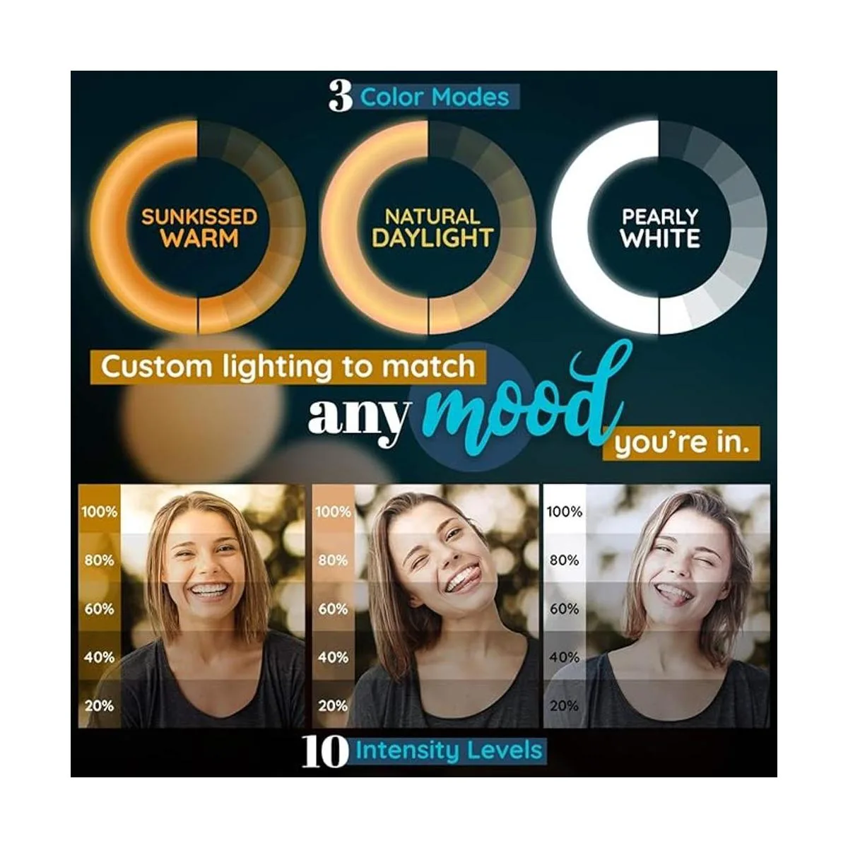 modo de iluminación: personaliza tu próxima sesión de fotos o iluminación de videoconferencia. con 3 modos de iluminación diferentes y 10 ajustes de brillo diferentes, los filtros y tiktok son cosa del pasado