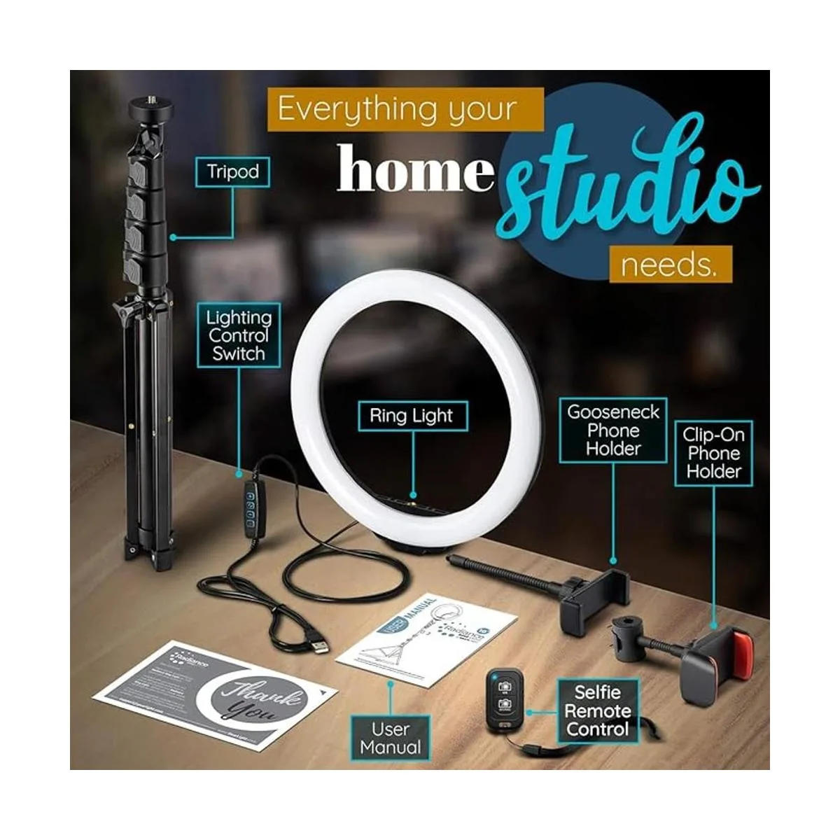 juego económico: este anillo de luz con soporte y soporte para teléfono te ofrece el paquete completo de iluminación de estudio profesional. incluye un anillo de luz de 10 pulgadas, control remoto bluetooth para selfie, soporte de trípode de aluminio y 2 soportes diferentes para teléfono.