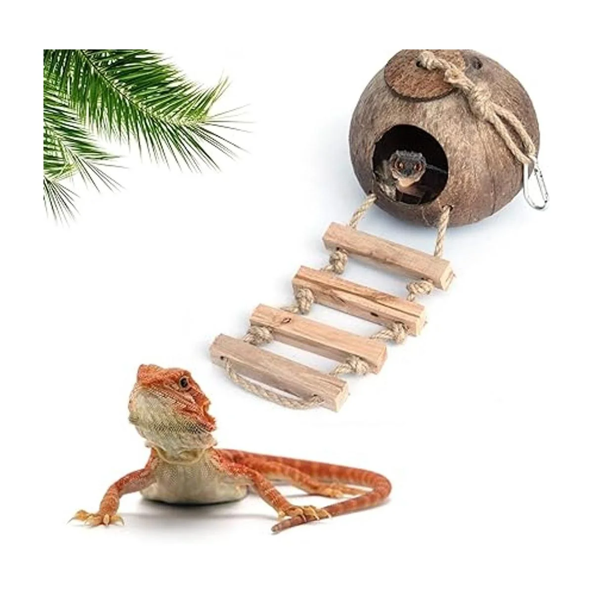 Diseño de escalera de cuerda de madera: cabaña para pájaros de coco y escalera de cuerda de madera como una rama de árbol. Tus mascotas aprenderán a controlar el balanceo y disfrutarán de balancearse y correr en el puente de aventura. Mantendrán saludables y activos. Mantendrá saludable y activo. Tanto los gecos de leopardo como los crestas adoran arrastrarse hacia arriba y abajo de la escalera. Mira cómo esperan en la escalera y agarran sus dulces desde el agujero interior.