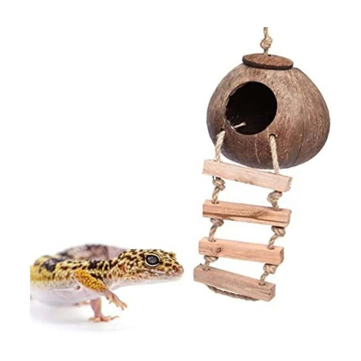 Gecko Cabaña de cáscara de coco, cabaña de pájaros, refugio para colgar en casa, dispensador de golosinas y alimentos, hábitat de cuevas duradero con lazo para colgar para gecko, reptiles, anfibios y animales pequeños