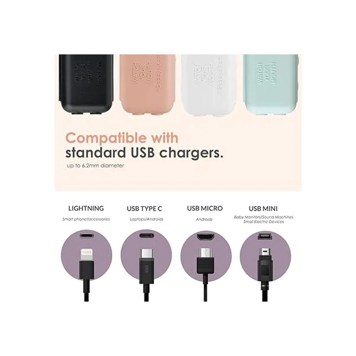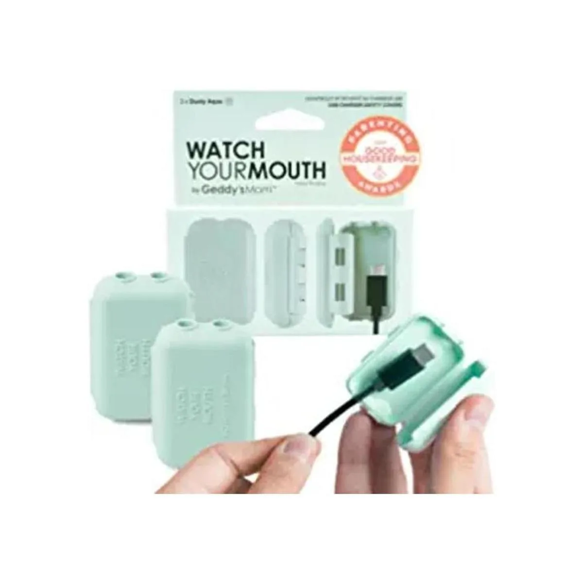 Protege a tu hijo de golpes eléctricos o quemaduras causadas por el extremo libre de un cargador USB enchufado. Es un peligro que envía a más de 200 niños anualmente a la sala de emergencias. Reduce drásticamente el riesgo de lesiones eléctricas a tu hijo por tu cargador USB enganchando una cubierta de seguridad del cargador USB Watch Your Mouth Se engancha y encapsula el extremo del conector de metal libre de la mayoría de los cables USB estándar, evitando manipulaciones por manos y boca curiosas.
