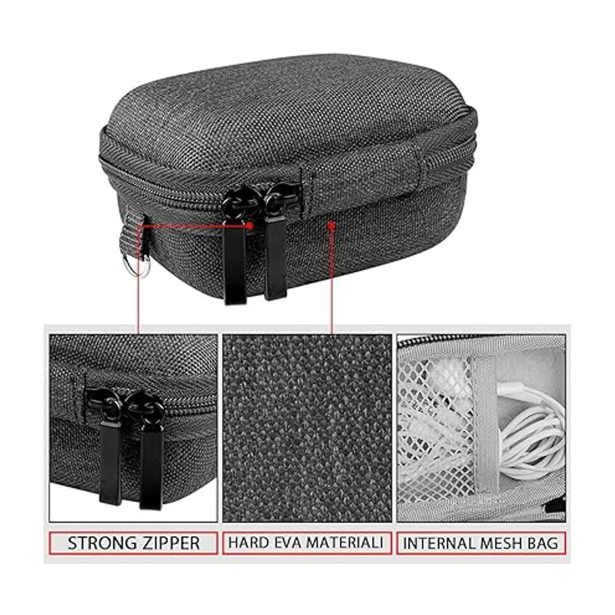 El bolsillo interno de malla almacena convenientemente cables, cargadores, almohadillas para los oídos, adaptadores y otros accesorios.