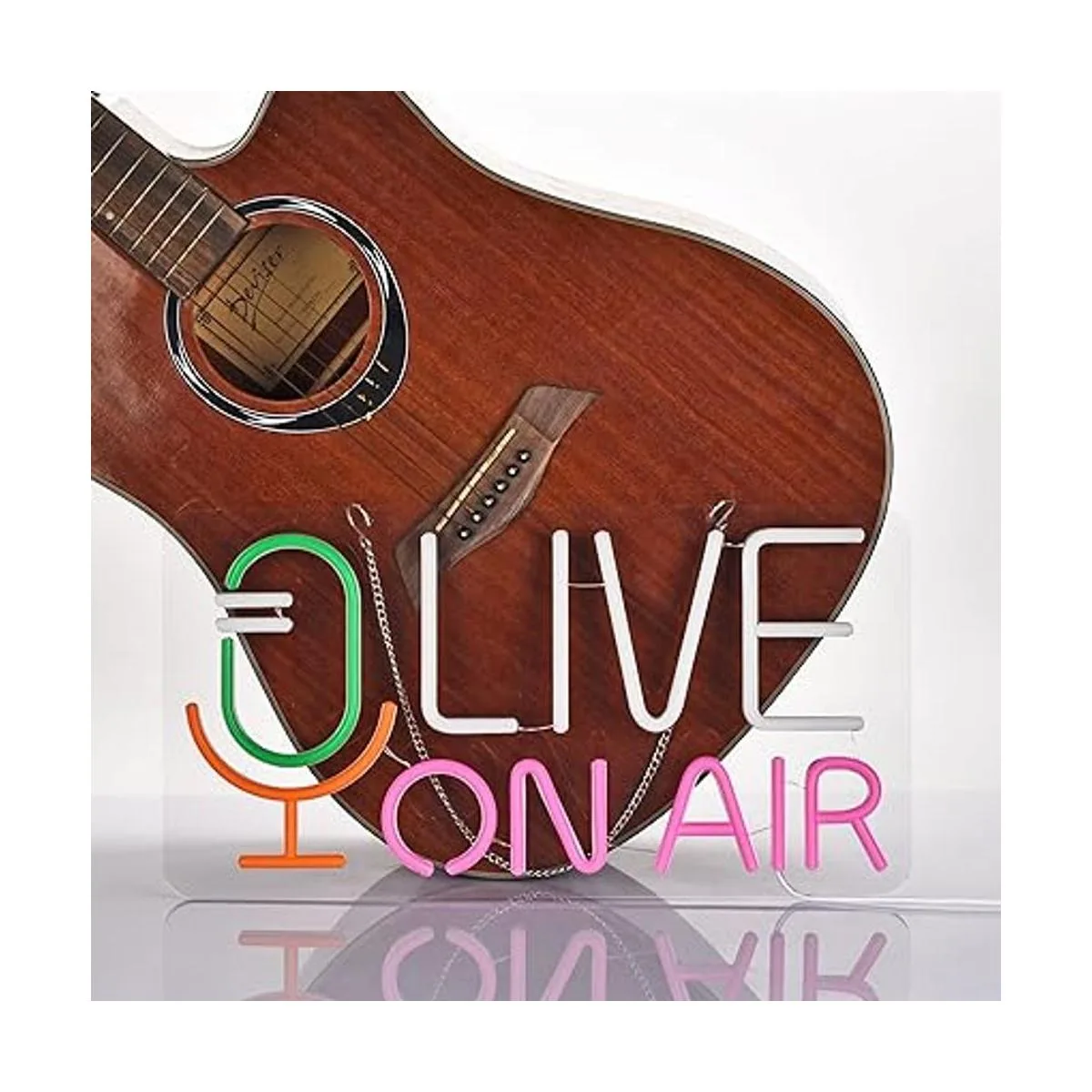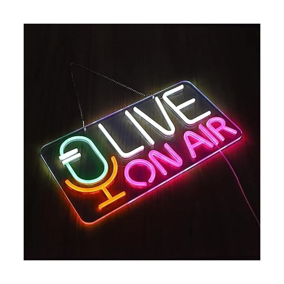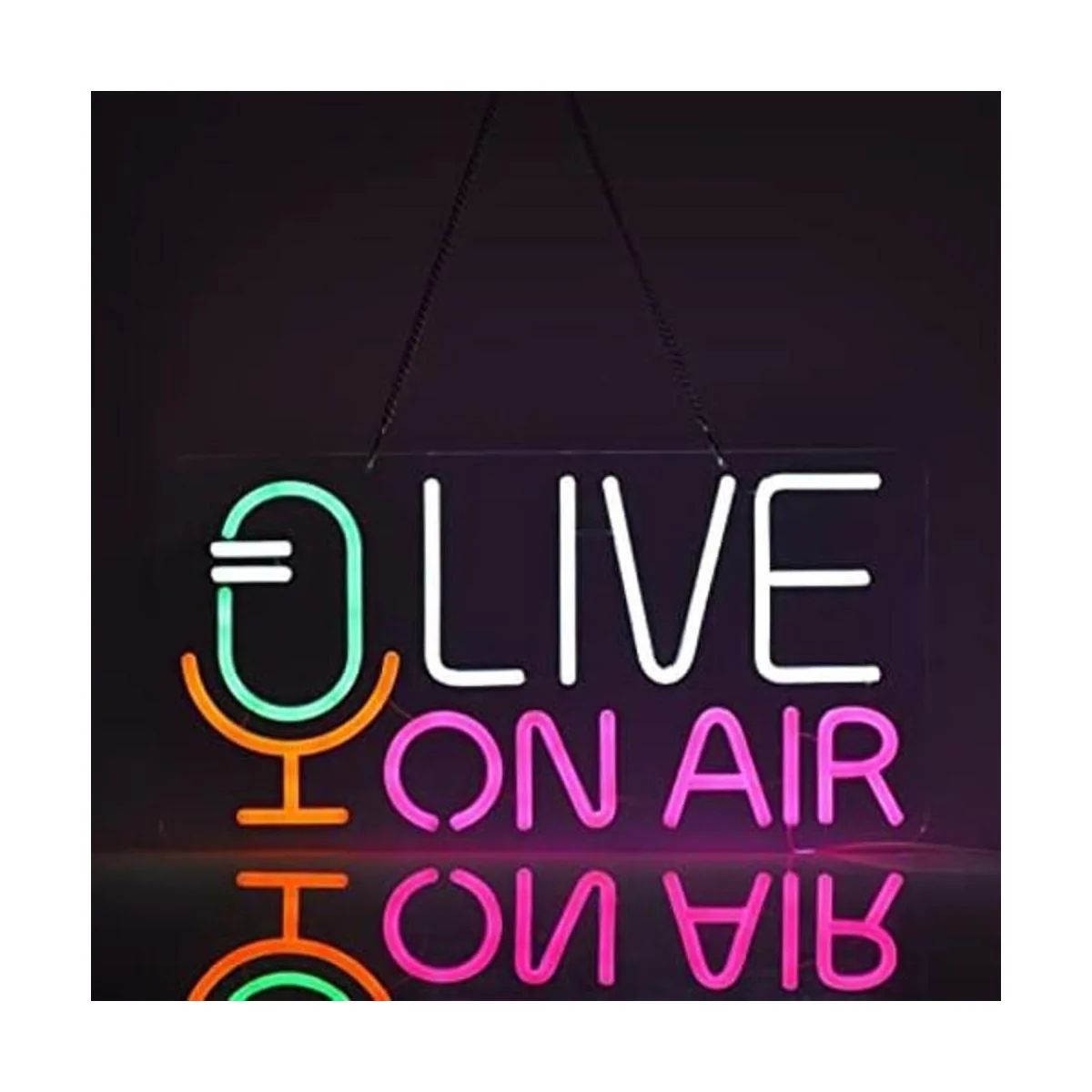 Letrero de neón Live on Air hecho de tira de luces LED de silicona flexible y fijado en un tablero acrílico transparente.