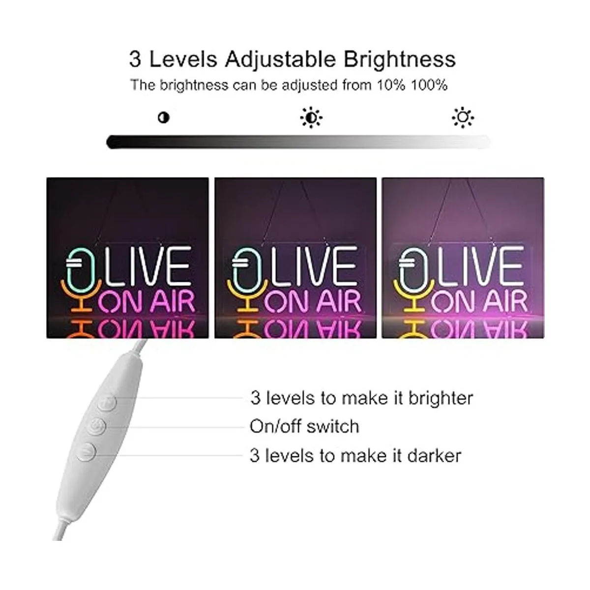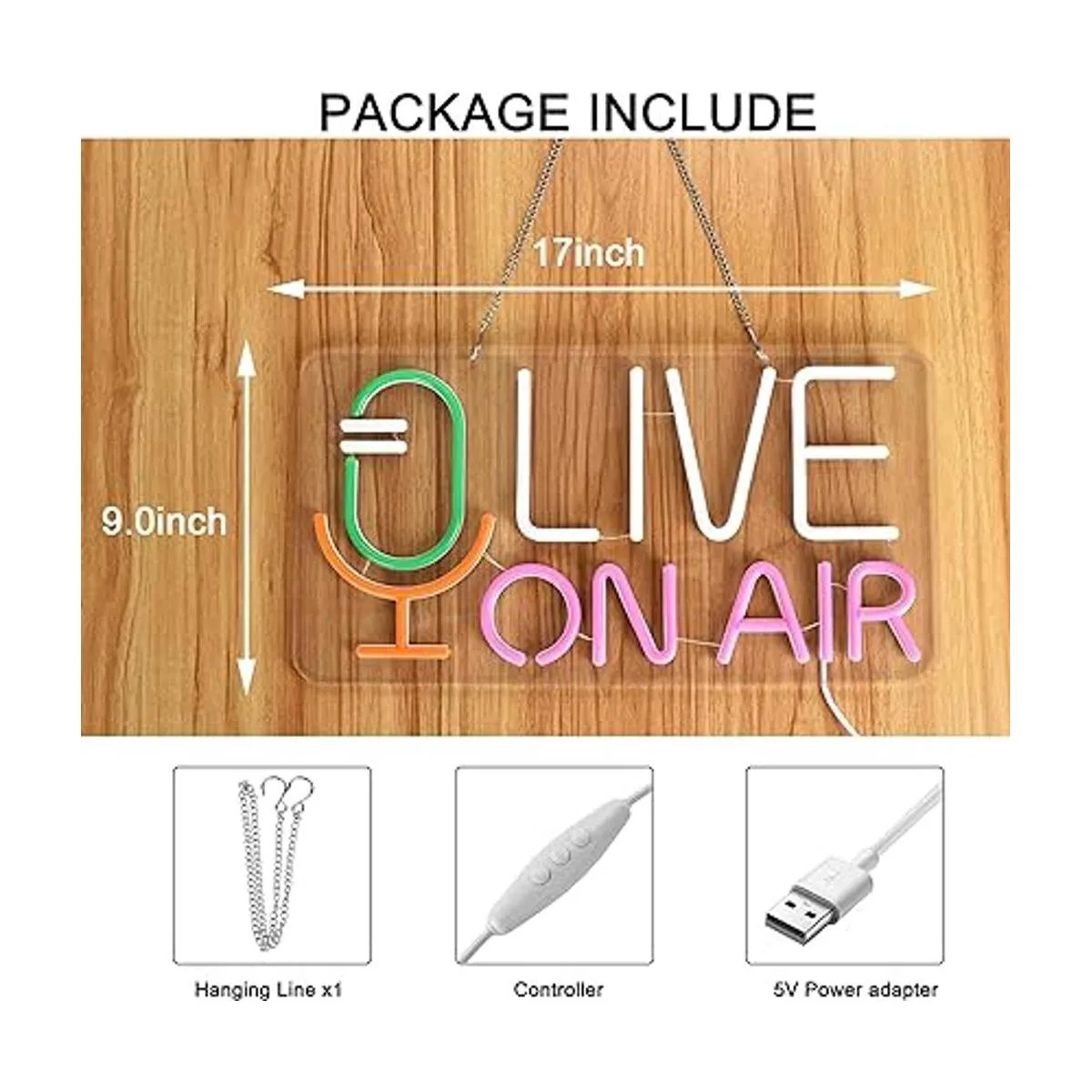 El letrero de neón Live on Air es de 16.9 x 9.1 in. Longitud del cable USB: 5.9 ft.