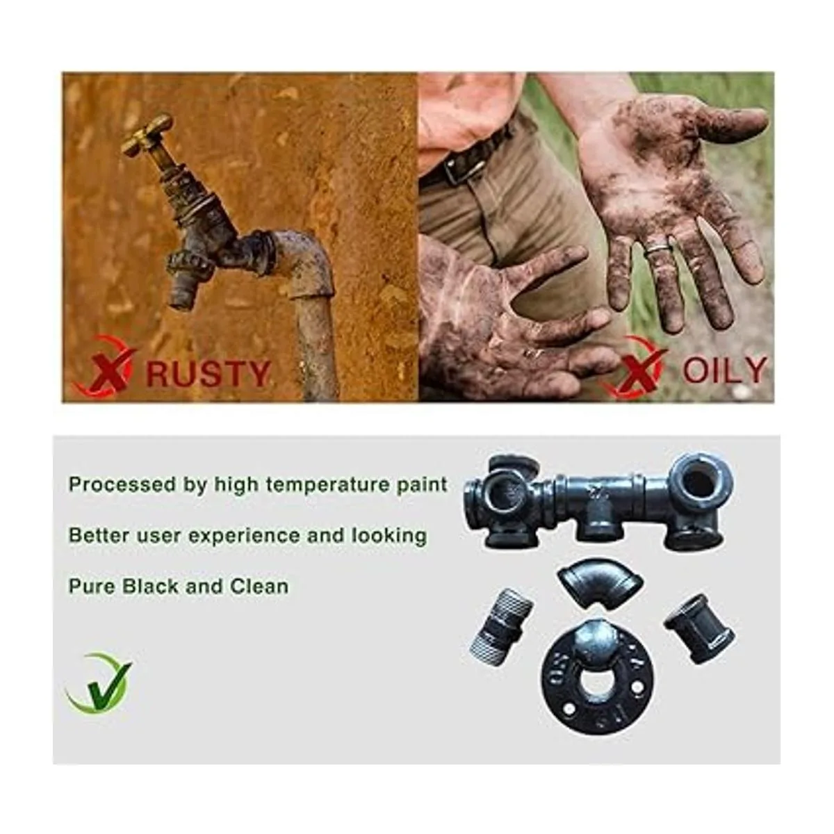 Material y productos: las tuberías y accesorios GeilSpace están diseñados con un acabado industrial estándar; materiales e hilos fabricados con hierro fundido resistente; a diferencia de la mayoría de otros productos en con aspecto gris y superficie aceitosa, la superficie de nuestros productos es negra y limpia después de pintura de alta temperatura, lo que proporciona una mejor experiencia de usuario y aspecto. La superficie de nuestro producto es inoxidable cuando la capa protectora de pintura está intacta.