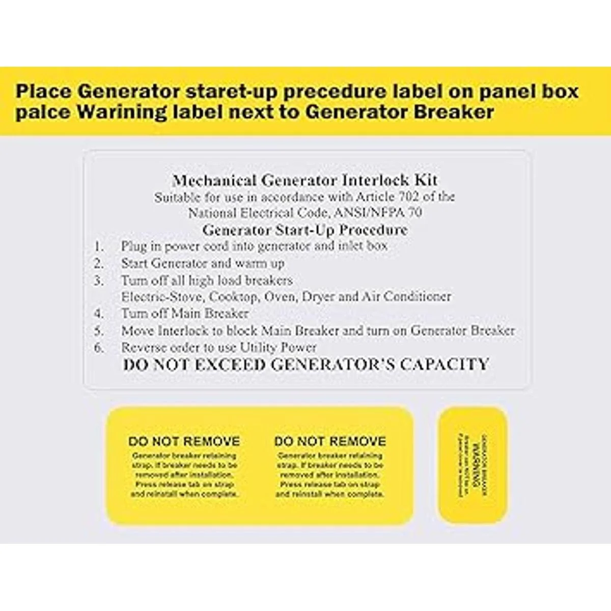 Lo que obtienes Interlock, etiqueta de procedimiento de arranque del generador, 5 etiquetas de recordatorio, 2 bridas, instrucciones de instalación y uso idioma español no garantizado, broca de tamaño adecuado
