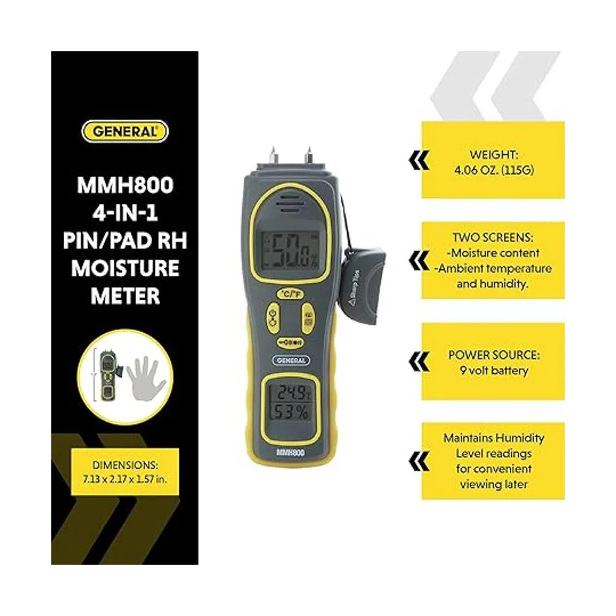 General Tools MMH800 medidor de humedad, tipo pin o sin pin, temperatura y humedad