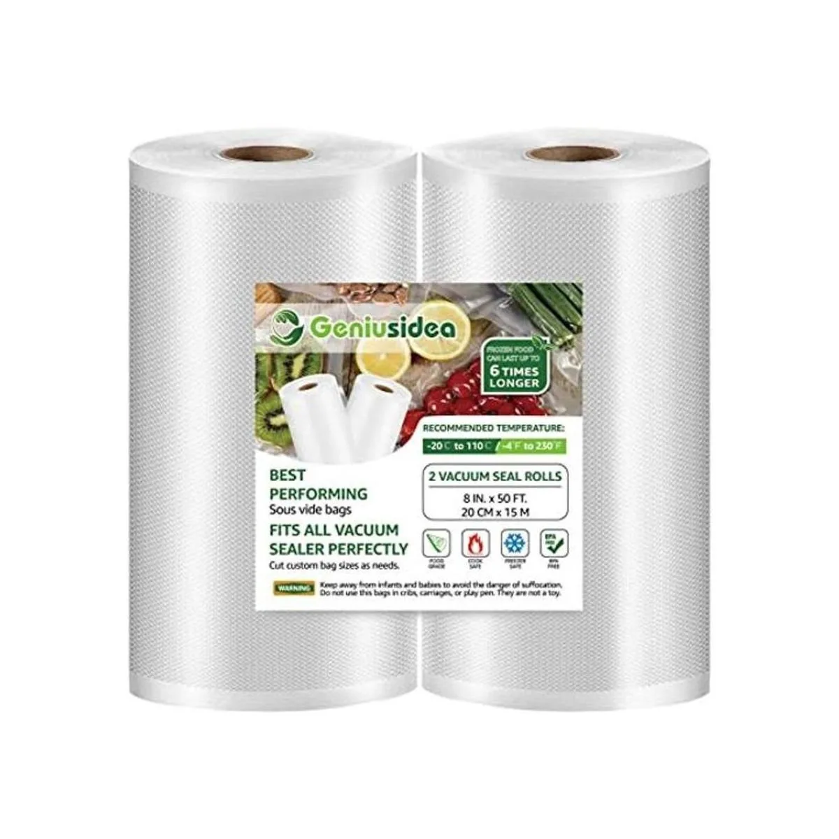 Geniusidea Bolsas selladoras al vacío de 8 x 50 pies, paquete de 2 para ahorrar alimentos, sellar una comida, sin BPA, grado comercial, bolsas ahorradoras de alimentos de ajuste personalizado para Sous Vide, preparación de comidas, almacenamiento al vacío 100 pies en total