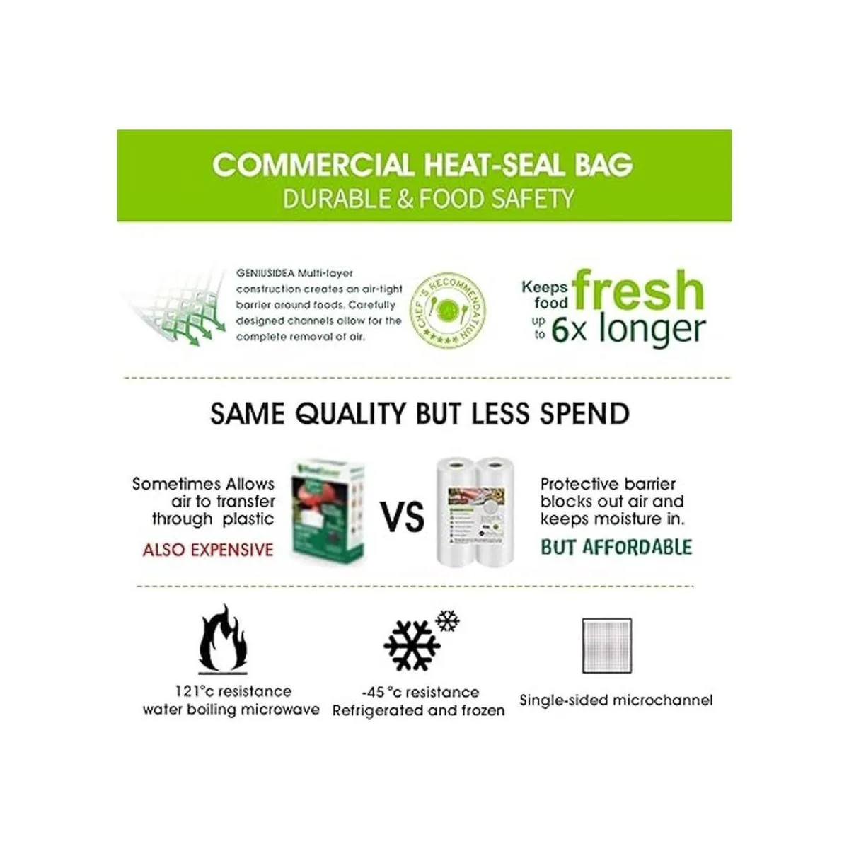 Uno para todos: la bolsa de almacenamiento de alimentos al vacío Geniusidea es compatible con todas las máquinas selladoras al vacío estilo abrazadera. Los rollos de sellado térmico se pueden cortar al tamaño exacto como necesites sin desperdiciar material.