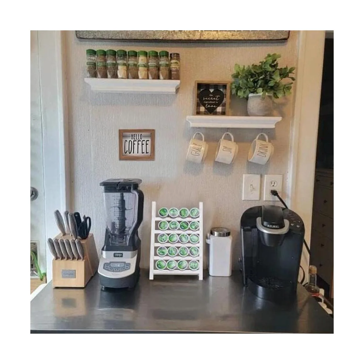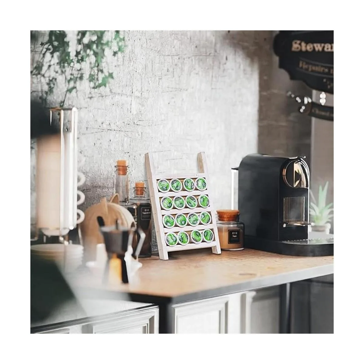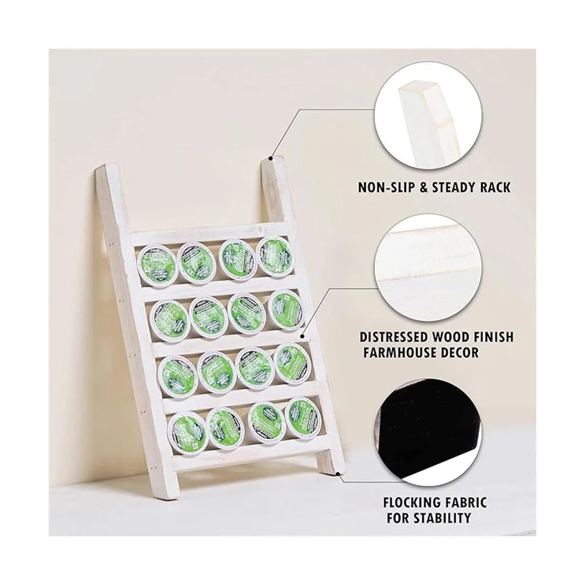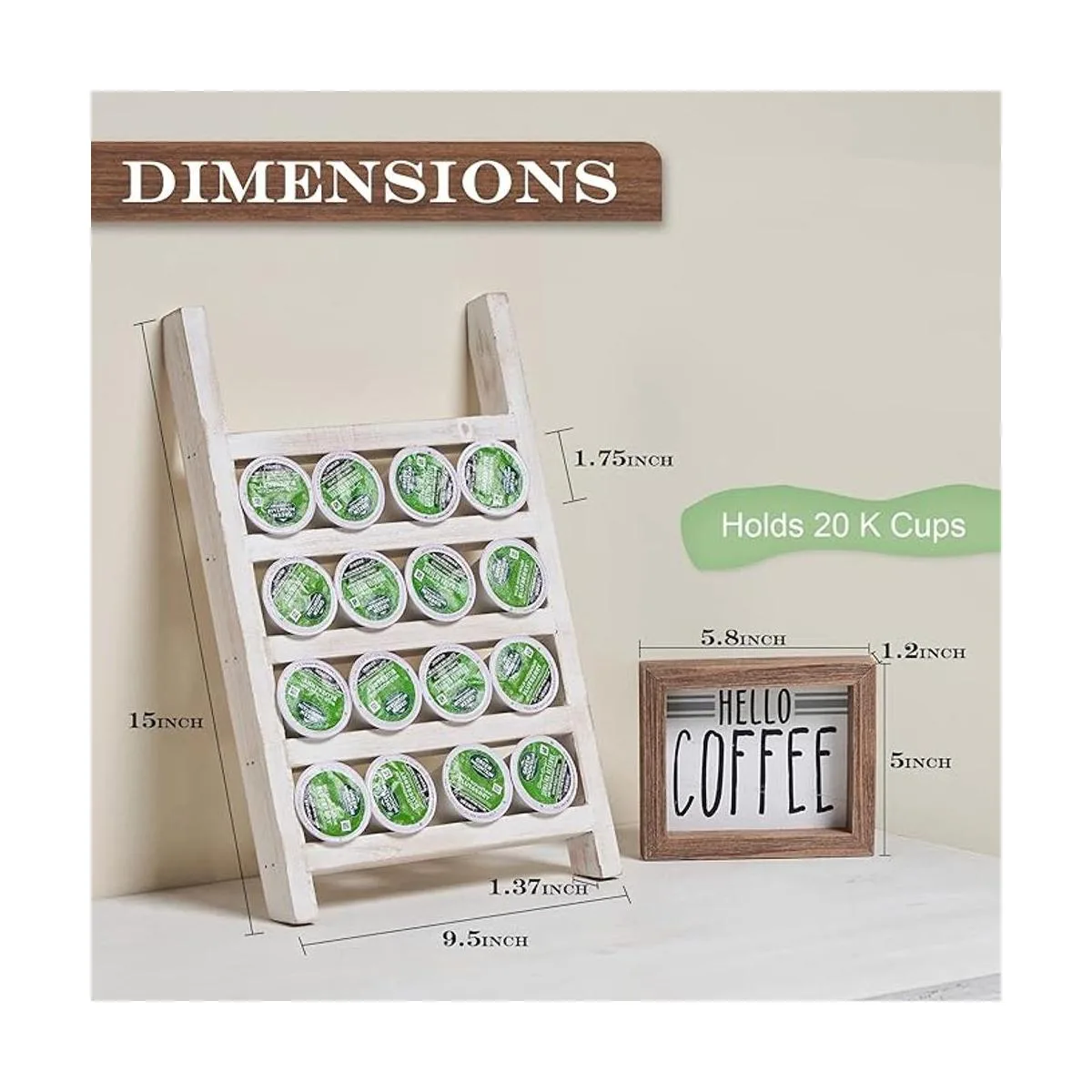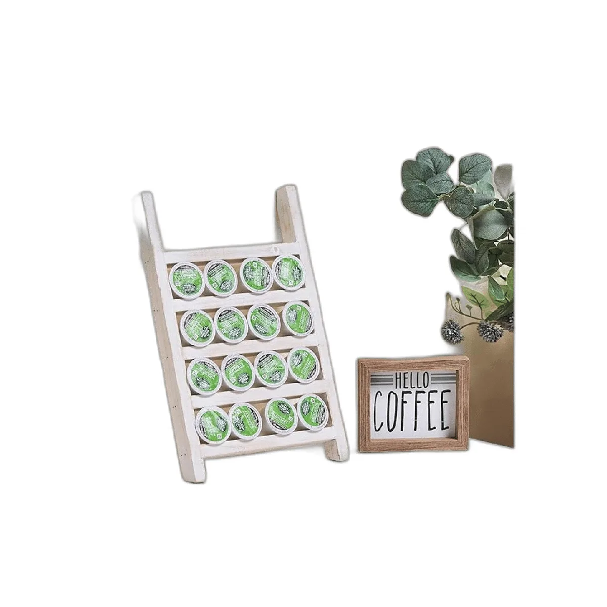 GENMOUS Farmhouse Soporte para cápsulas de café con escalera para encimera, soporte de cápsulas Keurig de madera rústica para almacenamiento de cocina en el hogar, organizador de estación de café para accesorios de barra de café, color blanco
