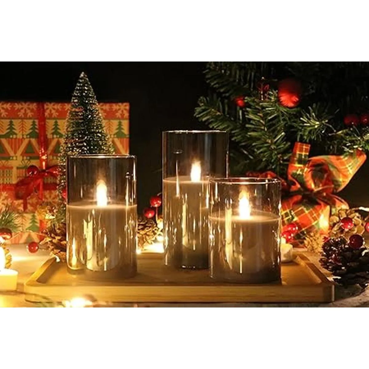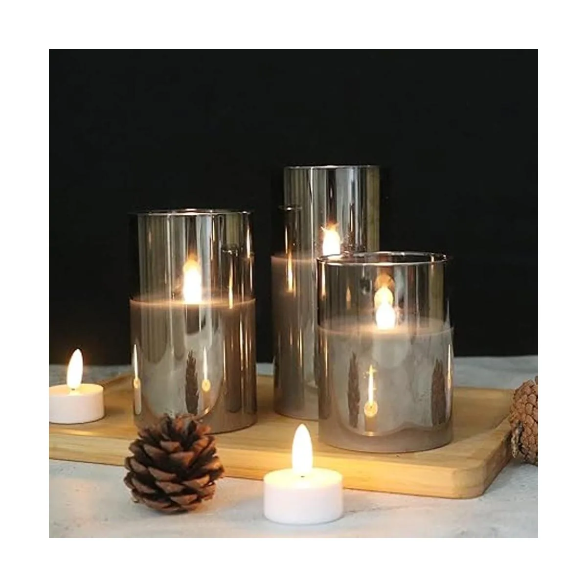 GenSwin Velas LED sin llama de cristal gris que funcionan con batería, con temporizador y control remoto de 10 teclas, velas de cera real de luz cálida que parpadean para la decoración del hogar y festival de boda juego de 3 unidades