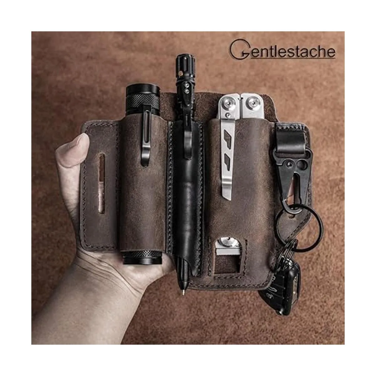 Gentlestache Funda multiherramienta para cinturón, funda de cuero para hombre, organizador de bolsillo EDC de cuero con soporte para bolígrafo, llavero, funda de linterna, bolsa de cuero EDC marrón oscuro