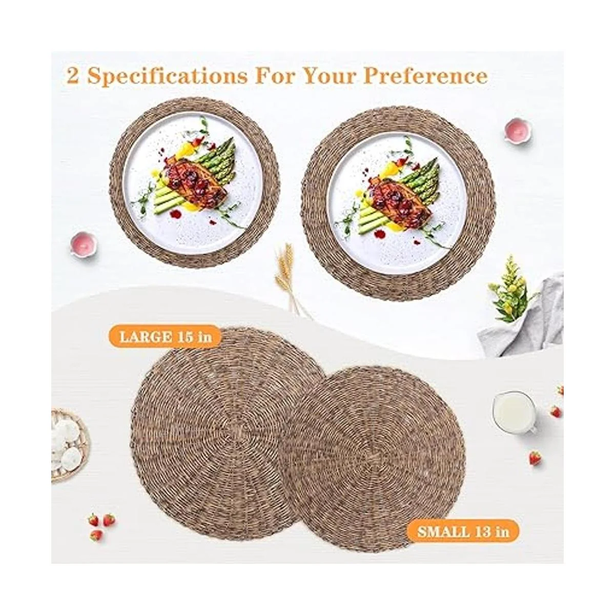Especificaciones disponibles: las alfombrillas redondas vintage tienen dos dimensiones, una es de 15 pulgadas de diámetro y la otra es de 13 pulgadas. Puedes elegir lo que prefieras. Los cargadores naturales rústicos combinan bien con mesas de comedor de madera, mármol, redondas, cuadradas u ovaladas. El paquete de 6 alfombrillas pequeñas y grandes son suficientes para la mayoría de los hogares.