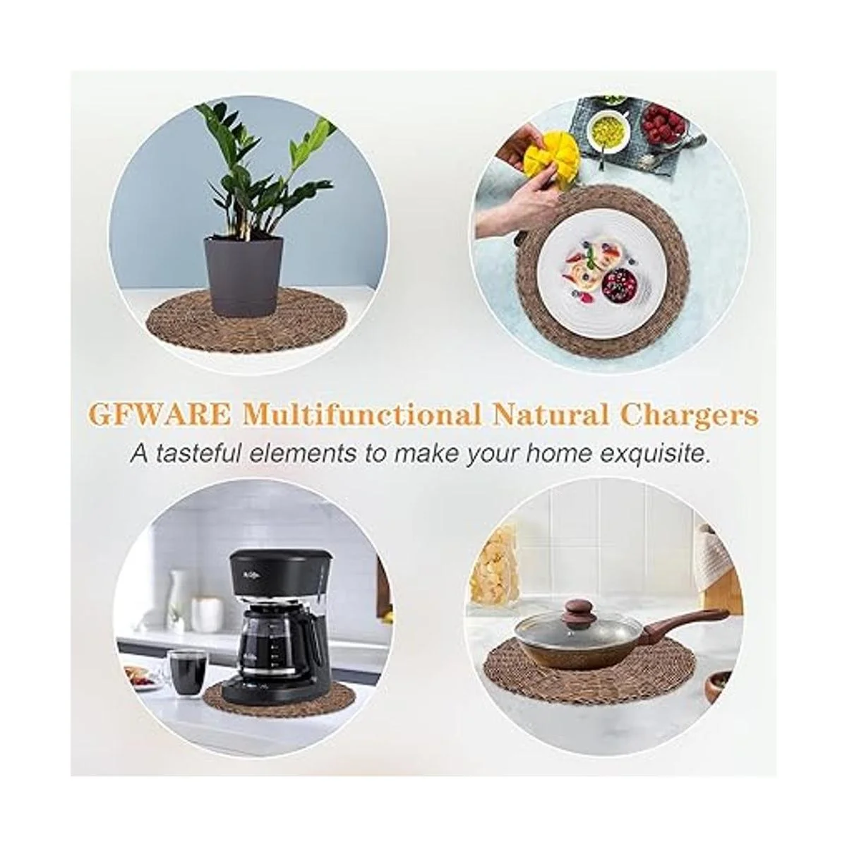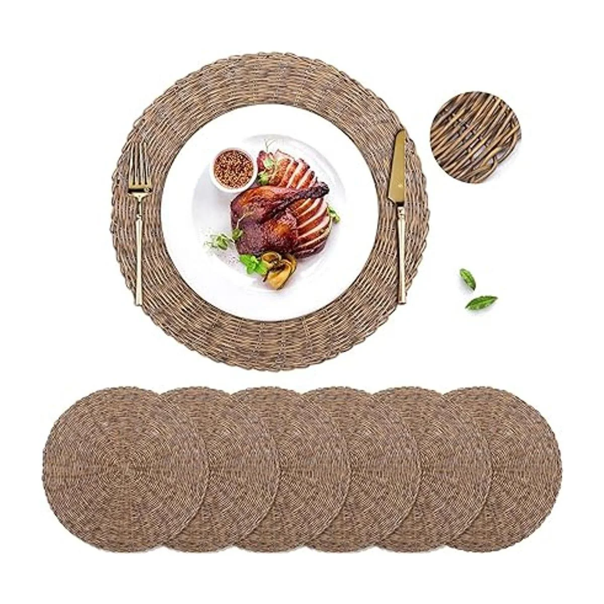 Adecuado para diferentes ocasiones: los cargadores de mimbre multiusos están diseñados para muchas ocasiones diversas como cenas festivas, celebraciones de aniversario, fiestas de cumpleaños y ceremonias de boda al aire libre, etc. Estos manteles individuales de tela marrón también serán una opción recomendable para restaurantes, comedor y hotel, o casas de campo, villa y patio de jardín.