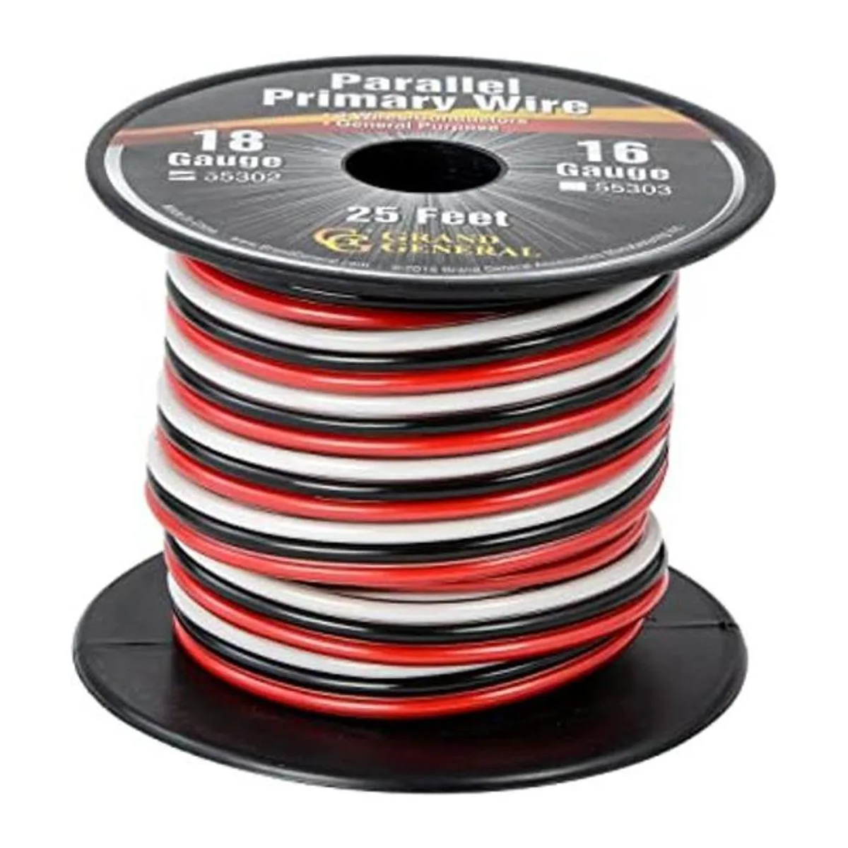 GG Grand General 55302 Parallel Primary Rollo de 3 alambres con carrete para camiones, automóviles y más Negro, rojo y blanco
