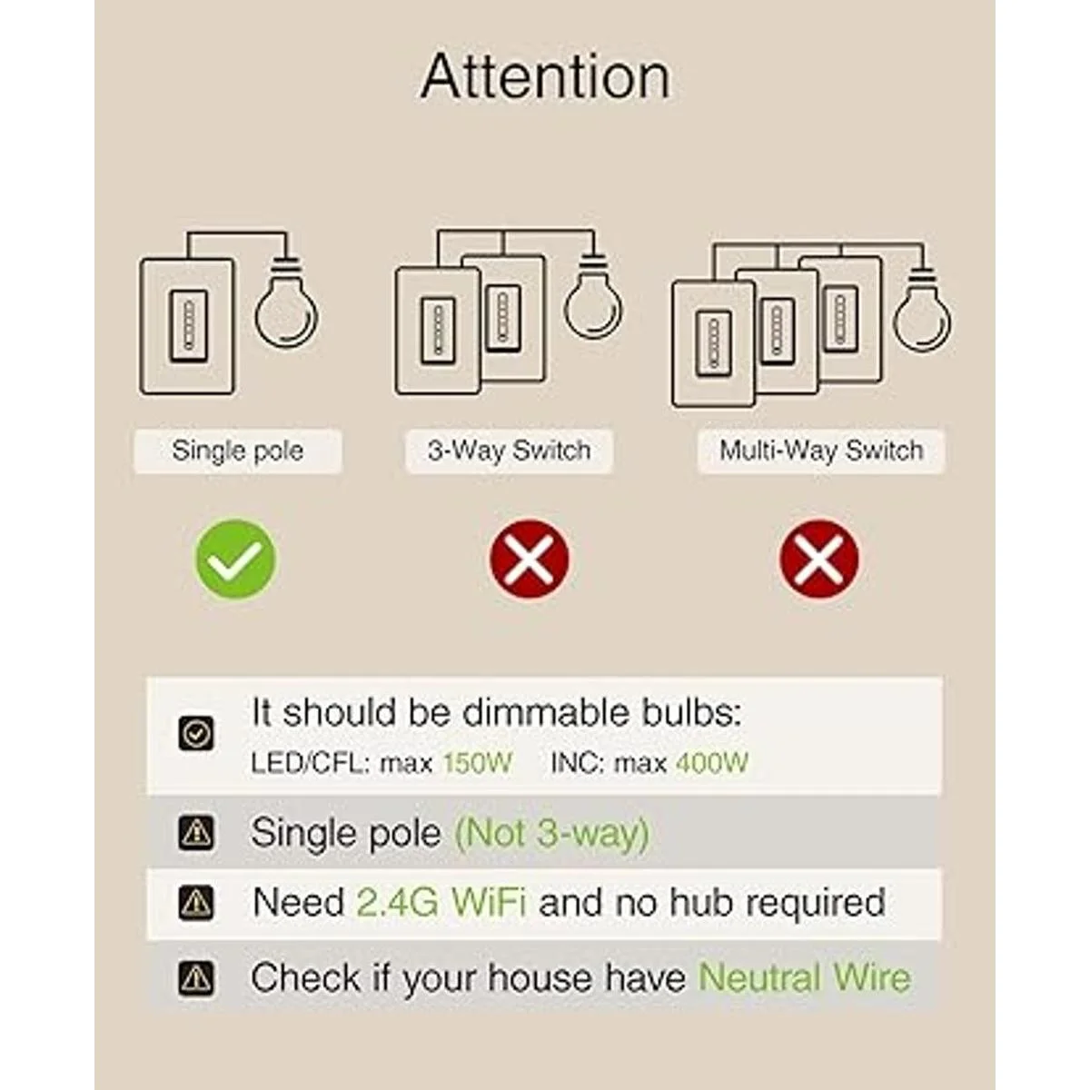 Nota: certificado UL y FCC. Se necesita cable neutro; las instrucciones paso a paso te guiarán a través del proceso de cableado. El tamaño estándar se adapta a cualquier placa de pared estándar de varias bandas. Solo uso de un solo polo no de 3 vías; WiFi 2.4G solo para la primera instalación no 5G