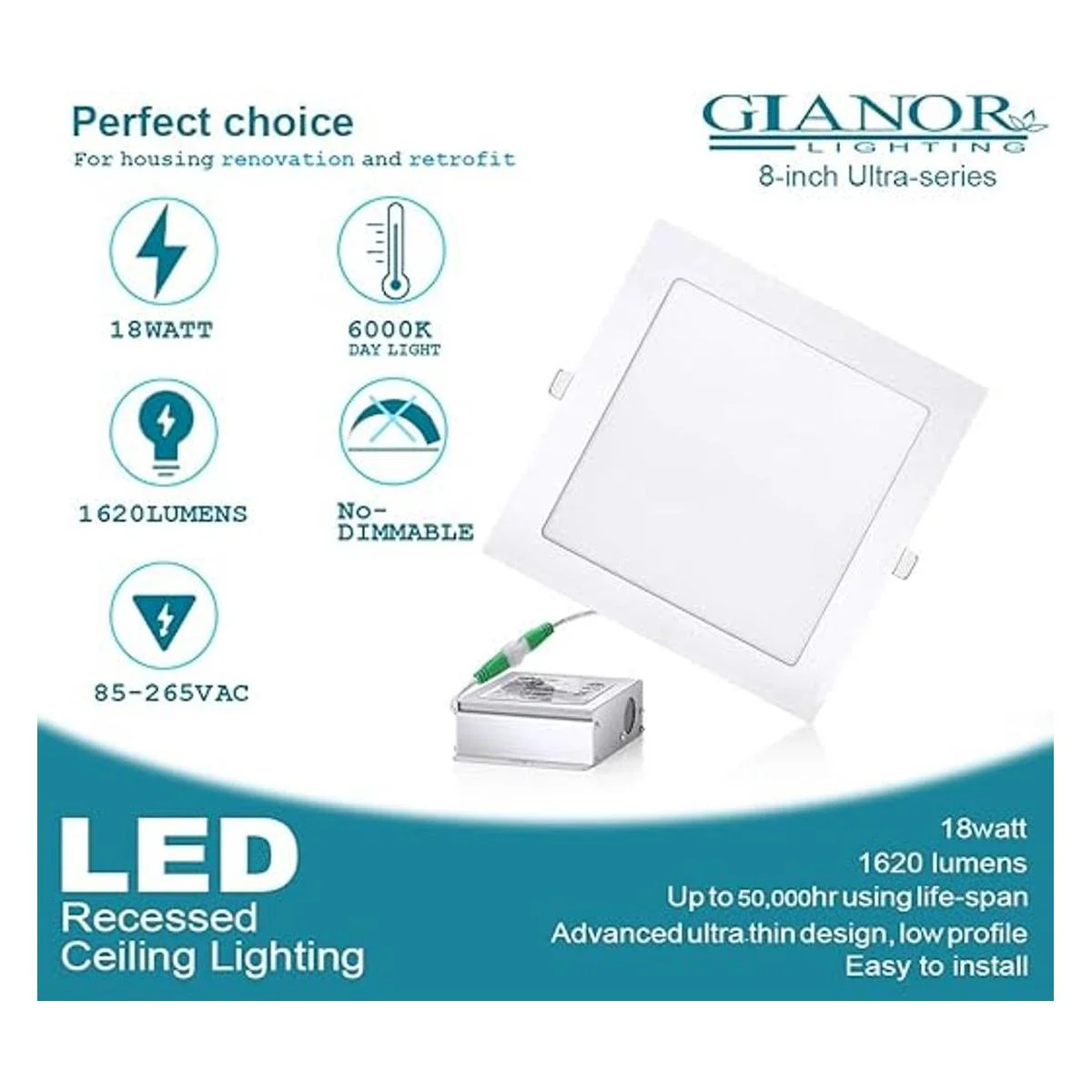 Gianor Luz empotrada cuadrada ultrafina de 8 pulgadas de 18 W con caja en J, luz diurna de 6000 K, equivalente a 150 W, luz de techo no regulable