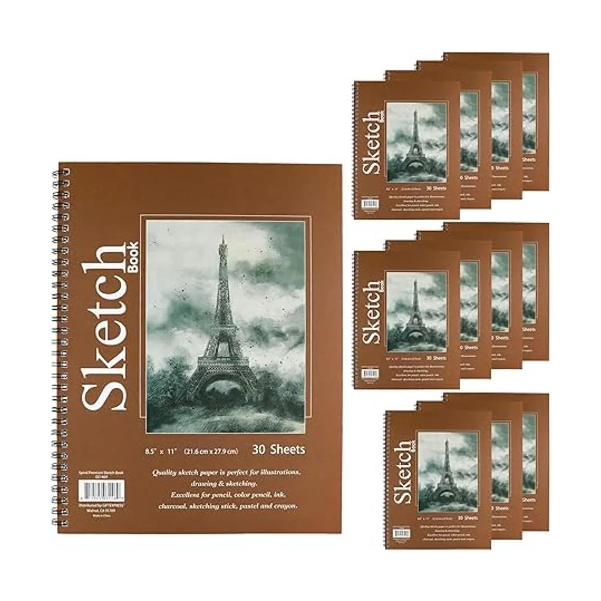 GIFTEXPRESS Paquete de 12 blocs de bocetos de tamaño carta, encuadernado en espiral, de alta calidad, cuaderno de bocetos de lápiz, 30 hojas cada una, encuadernado con alambre lateral, hojas de papel blanco en blanco para lápiz, tinta, pastel